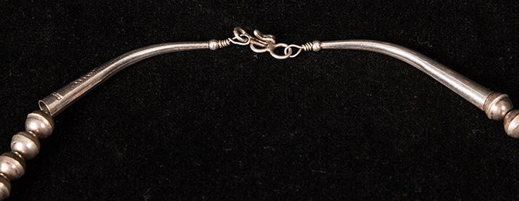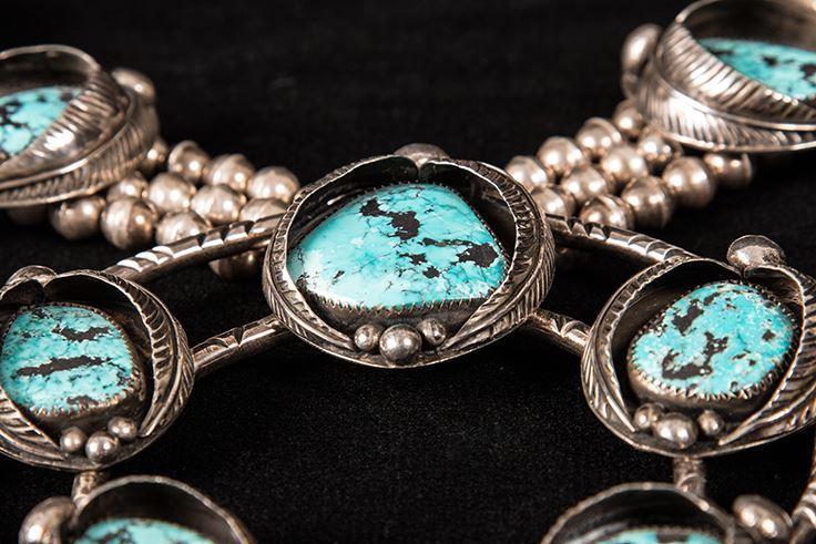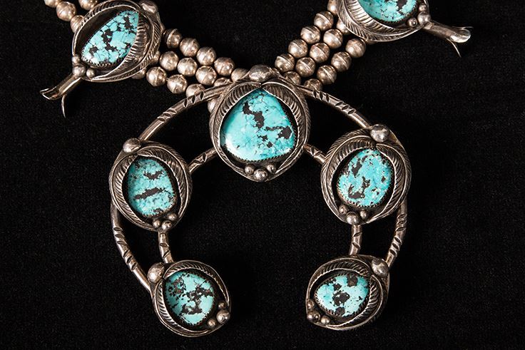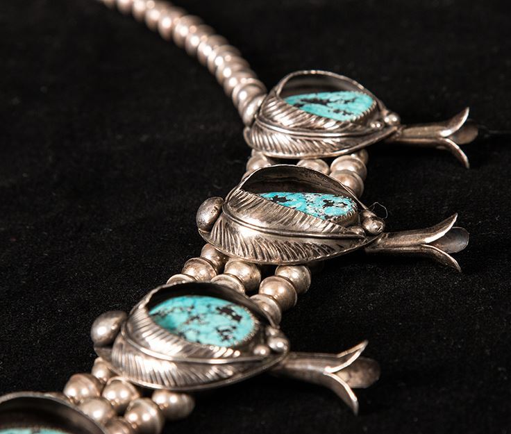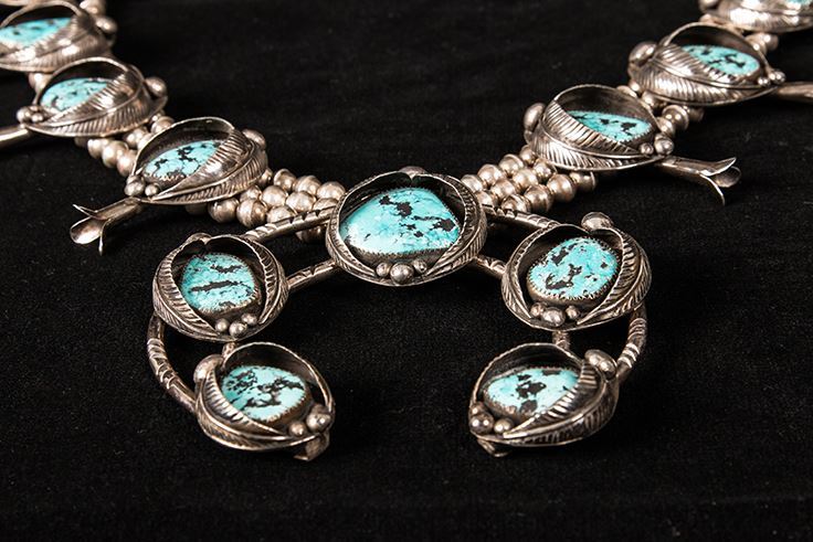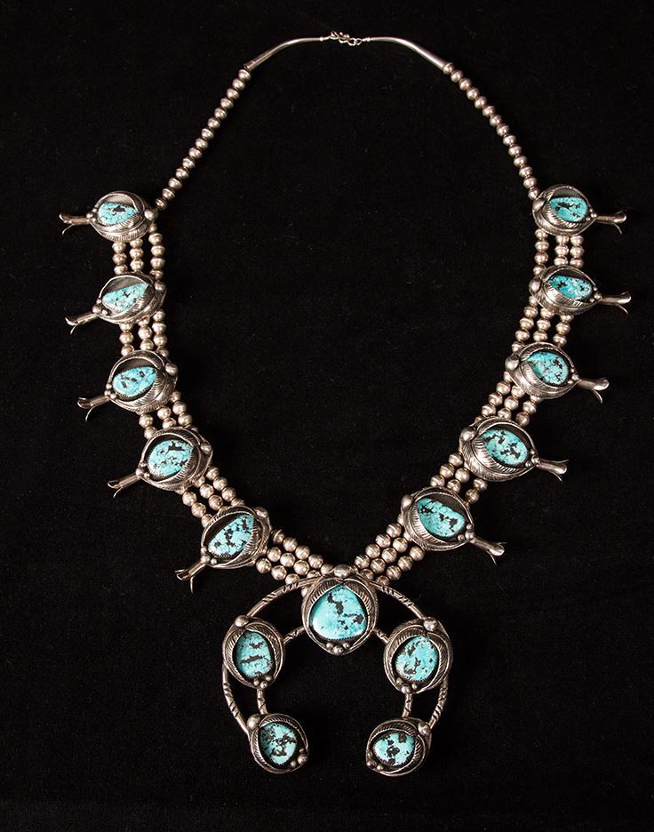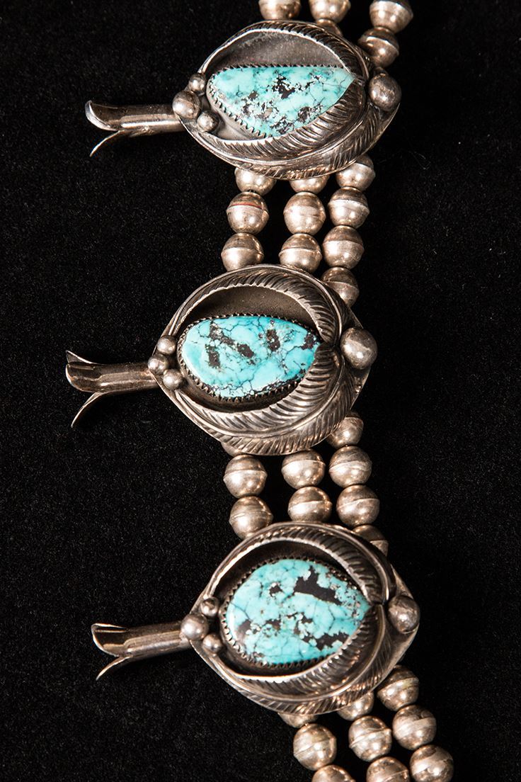 Navajo Squash Blossom Necklace. Large 18 ½" sterling silver leaf pattern with fine turquoise. Circa 1960's.