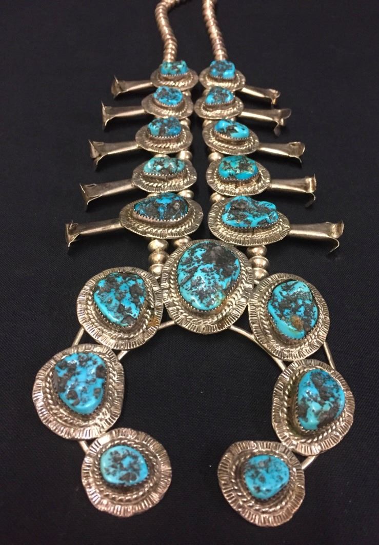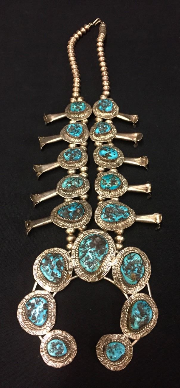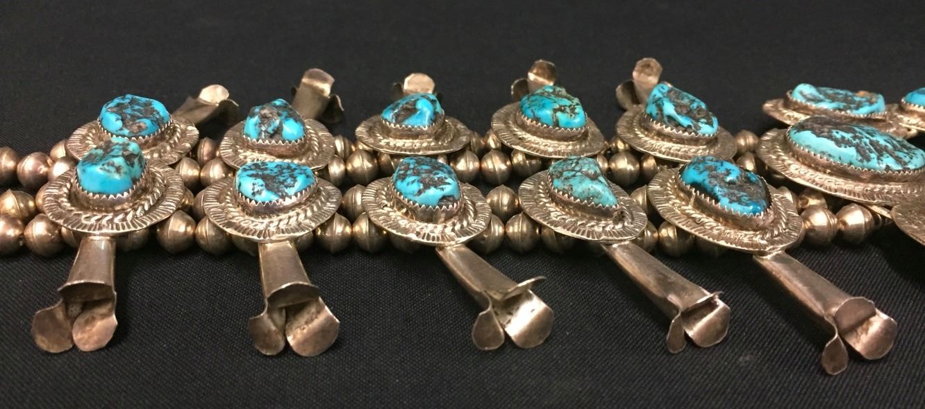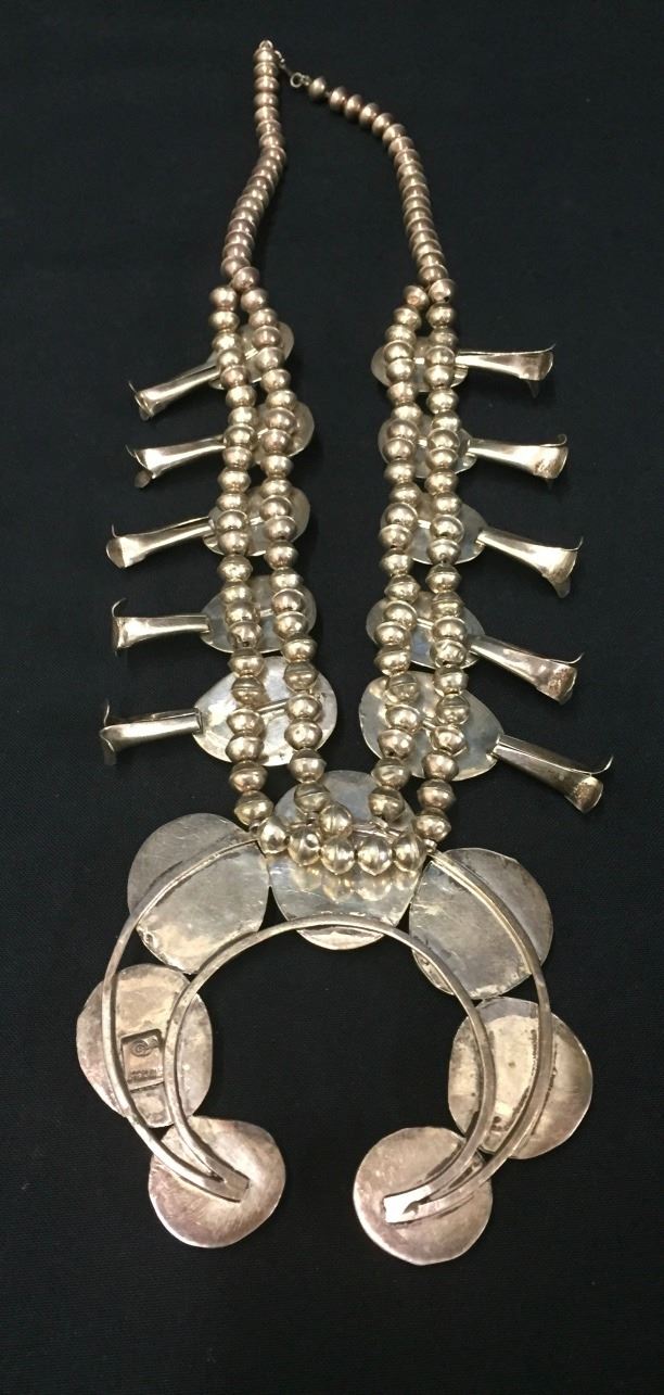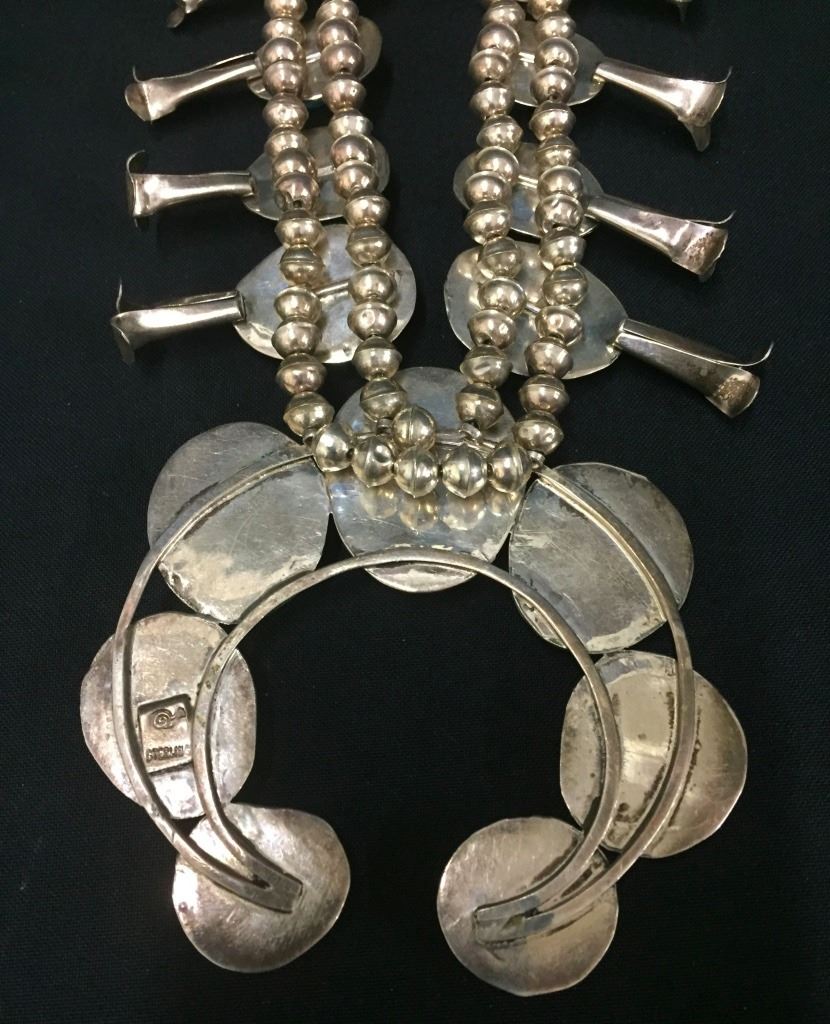 Maker: Marked with a Snail hallmark, which is believed to be, Bobby (Slow Hand) Etsitty, Navajo. Approx. Age: Circa 1980s - 90s. Size: Fits 22” around the neck and the Naja hangs down 3” in addition. Weighs 169.2g. Condition: Good. A couple of the blossom petals need to be straightened. Additional Info: A traditional style Navajo squash blossom necklace. Marked as Sterling. Please look closely at the pictures - they are an important part of our description. Shipping: There will be a $5 handling / packaging fee for shipping this lot. The actual cost of postage will be added on top of that.