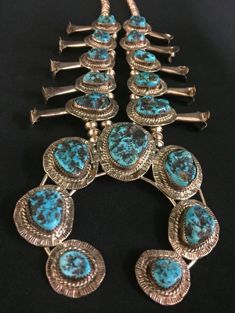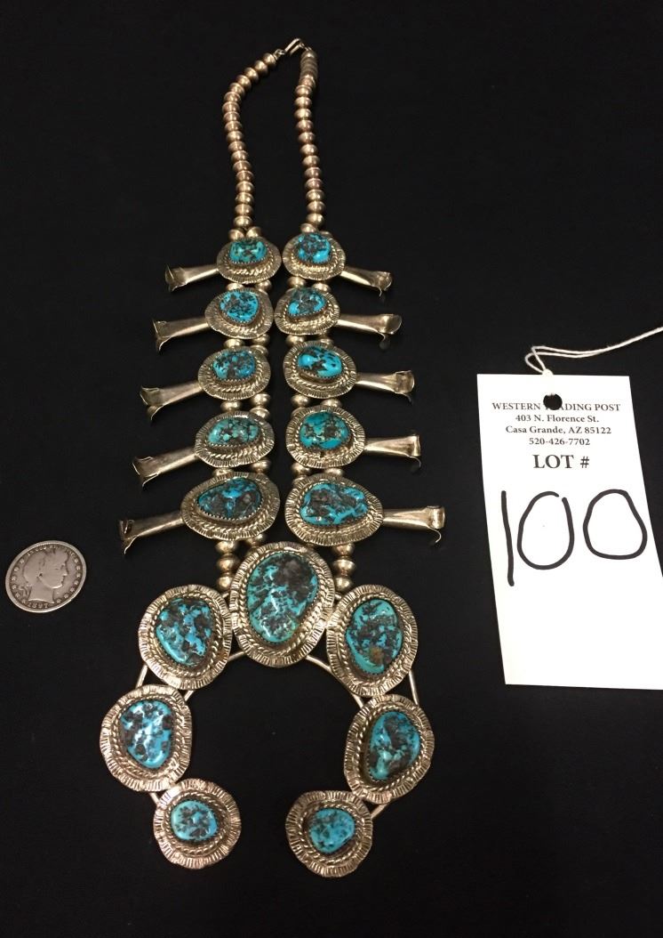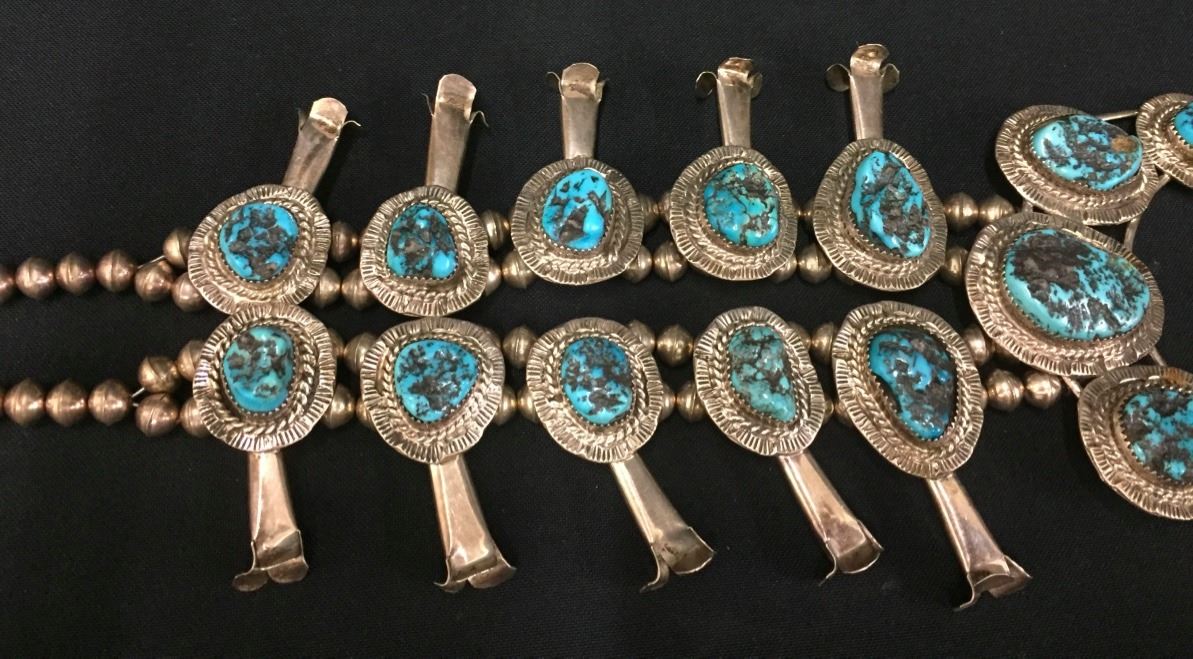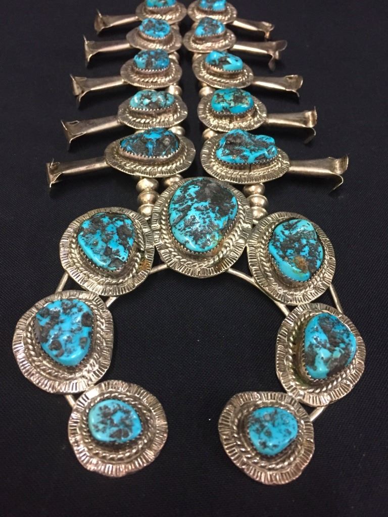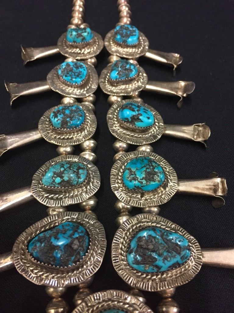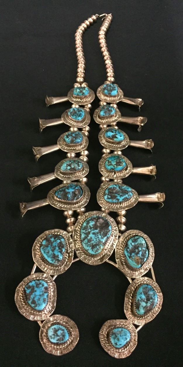 Maker: Marked with a Snail hallmark, which is believed to be, Bobby (Slow Hand) Etsitty, Navajo. Approx. Age: Circa 1980s - 90s. Size: Fits 22” around the neck and the Naja hangs down 3” in addition. Weighs 169.2g. Condition: Good. A couple of the blossom petals need to be straightened. Additional Info: A traditional style Navajo squash blossom necklace. Marked as Sterling. Please look closely at the pictures - they are an important part of our description. Shipping: There will be a $5 handling / packaging fee for shipping this lot. The actual cost of postage will be added on top of that.