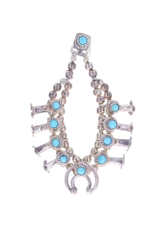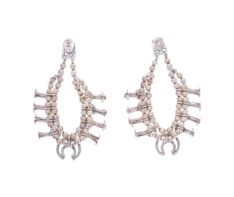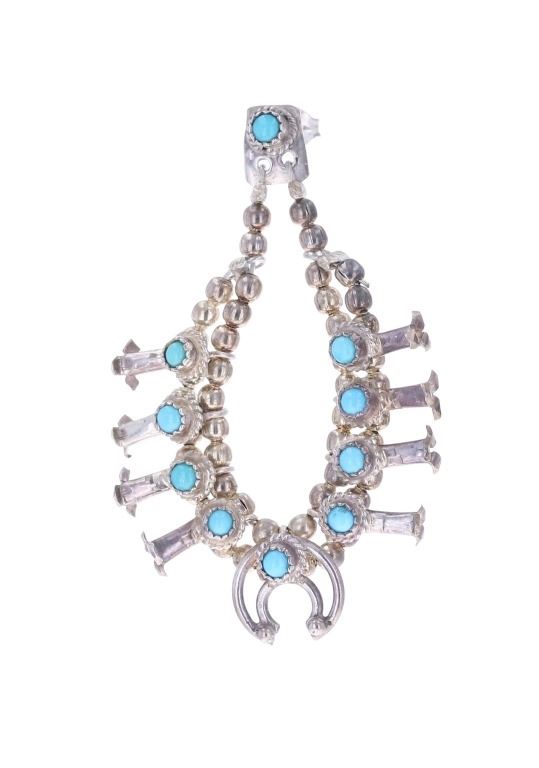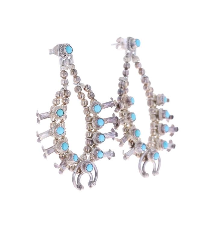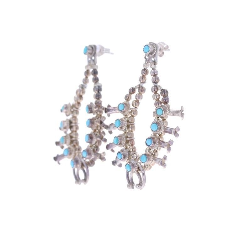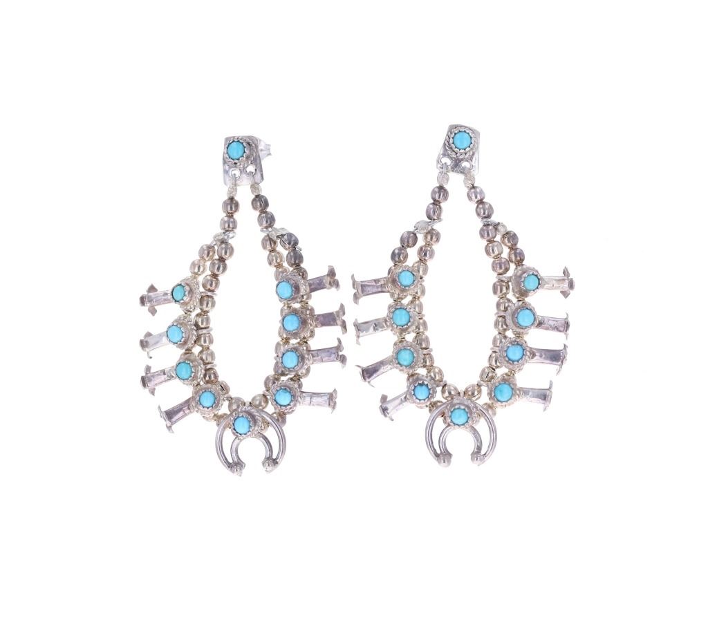 Featured in this lot is this beautiful pair of Navajo Sleeping Beauty turquoise and sterling squash blossom earrings done by Navajo artist Larry Curley. These stunning earrings are done in a squash blossom style with a naja and four blossoms down either side. The naja and the blossoms each have a sterling silver construction with a cabochon of stunning Sleeping Beauty turquoise. The earrings are marked on the back reading, "LAR". They measure 1 3/4" L x 1 1/8" W and weigh 10.2 grams.