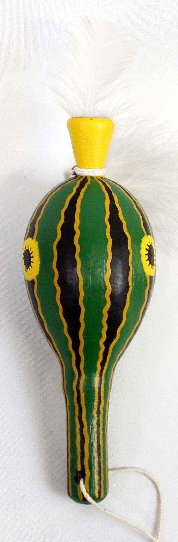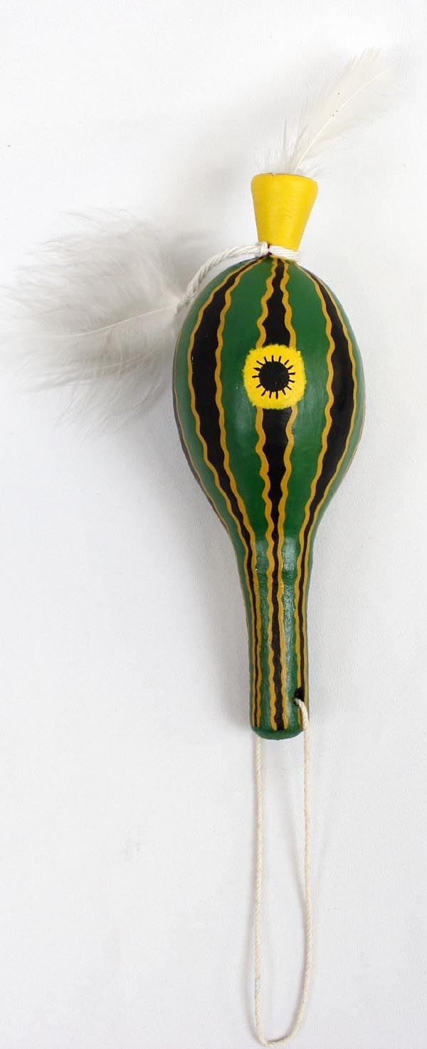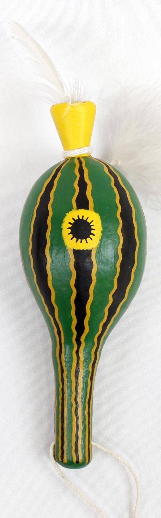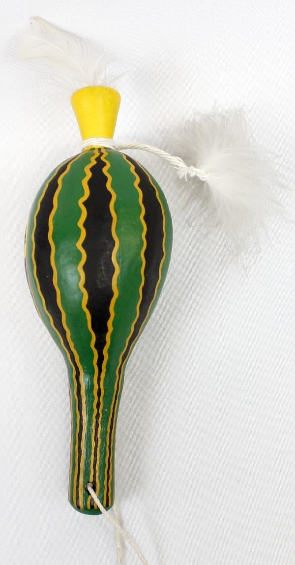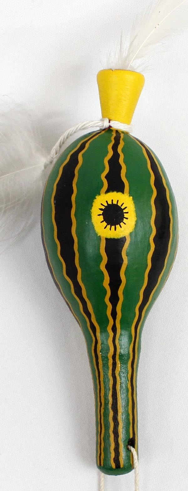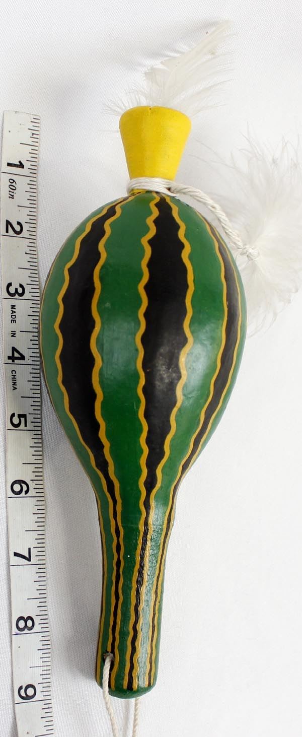 Native American Navajo Squash Man Gourd Rattle, measures 8"L, embellished with feathers, bright vibrant green in color