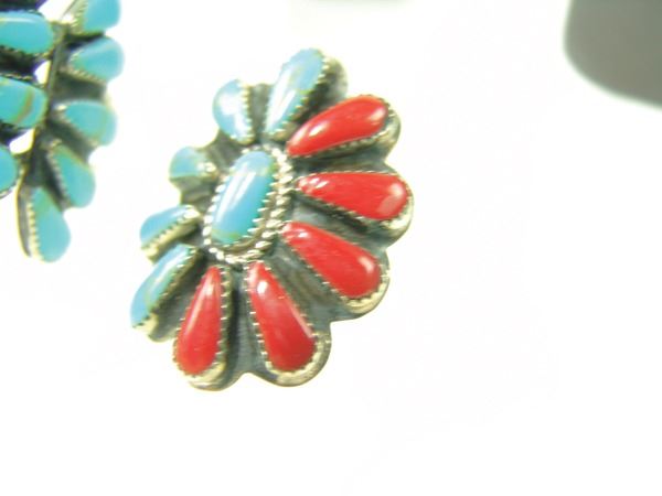 Outstanding, handwrought cluster design, 35" squash blossom necklace of turquoise and coral, with matching bracelet, earrings, and size 7 ring, done with sterling and nickel silvers. Excellent condition.