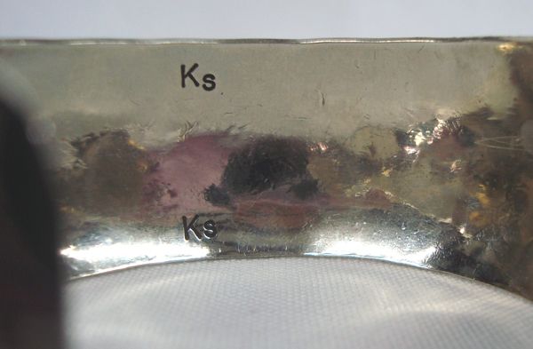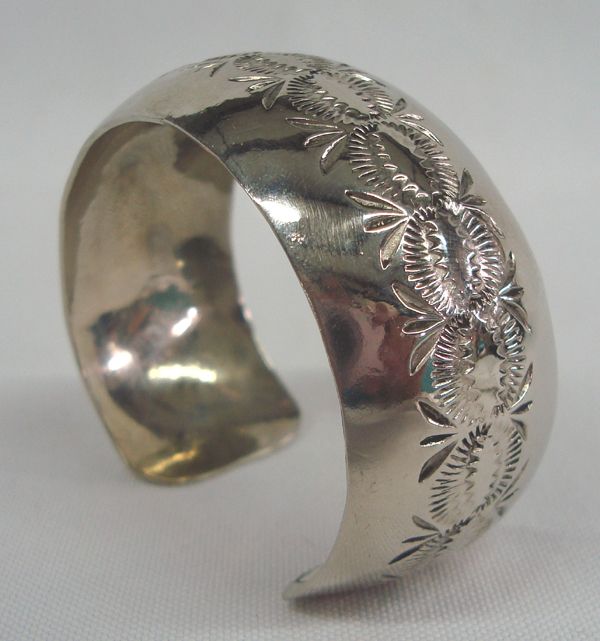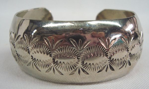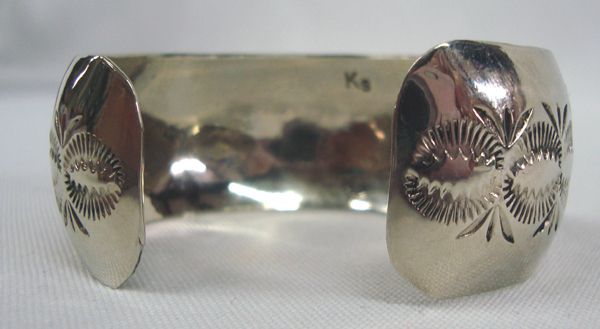 Navajo Stamped Sterling Silver Bracelet - Katalene Scott, hallmarked Ks. Brilliant silver bracelet with stamped design and artist's hallmark on inside, ''KS'' (Large ''K'' and small ''S''.) Measures 6.25'' inside including opening and 1''W.