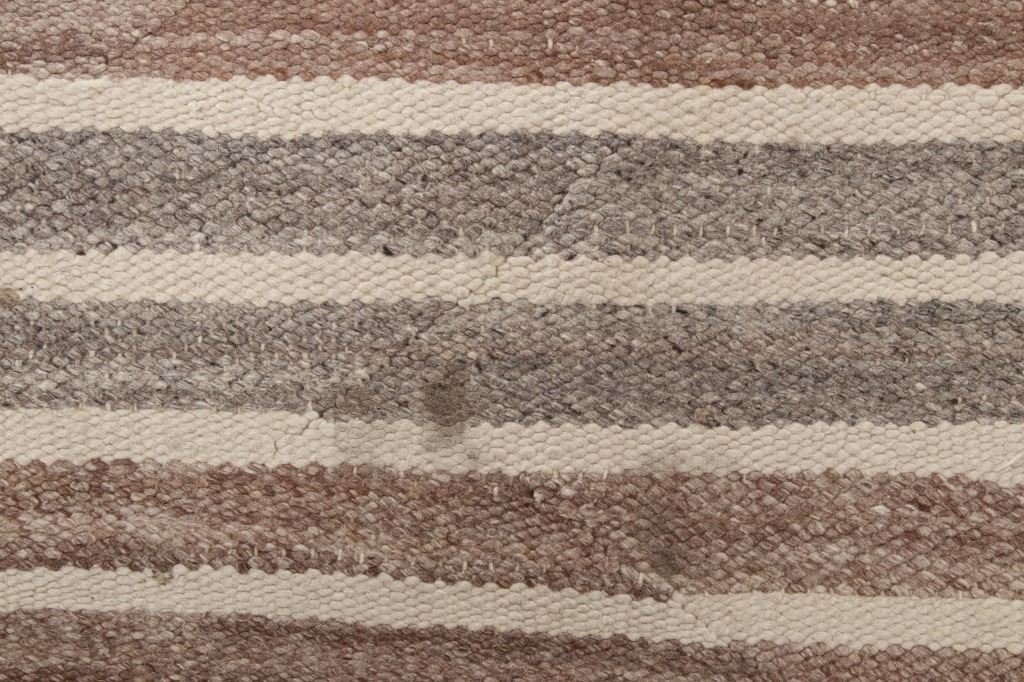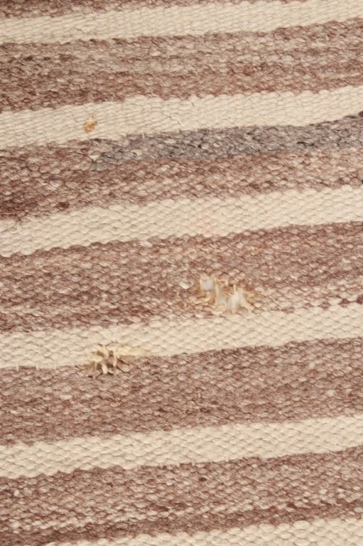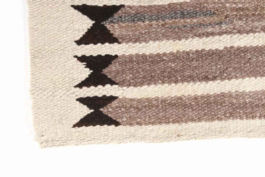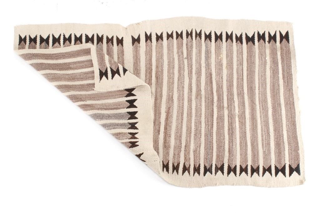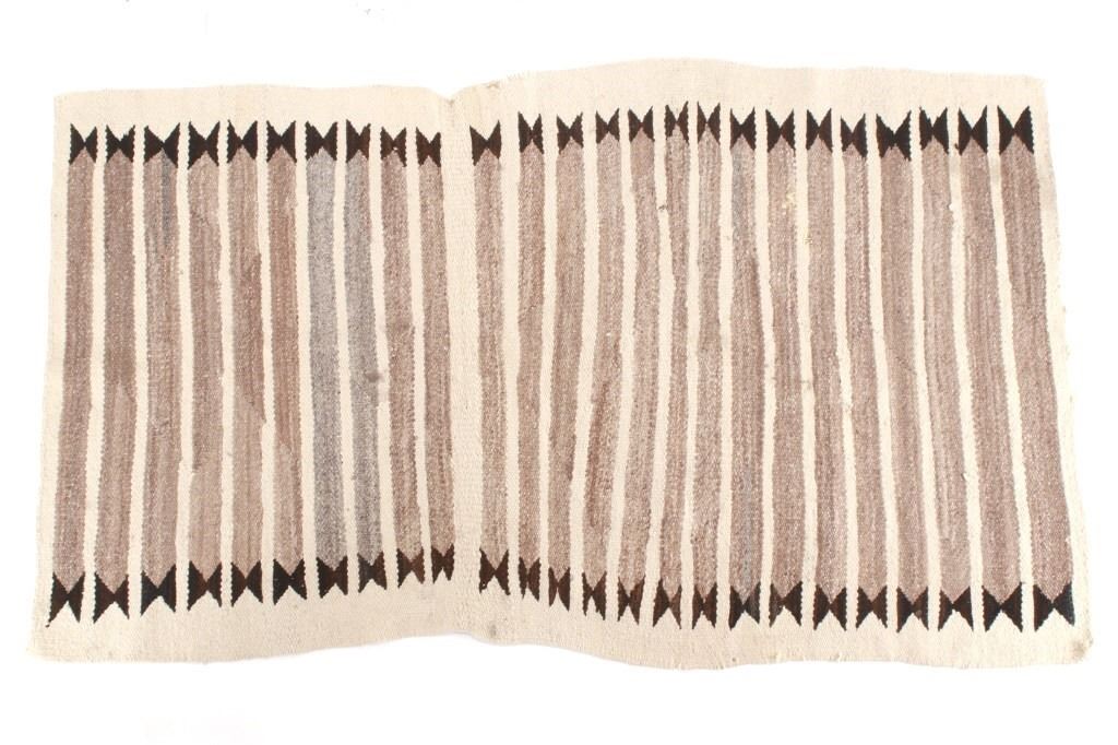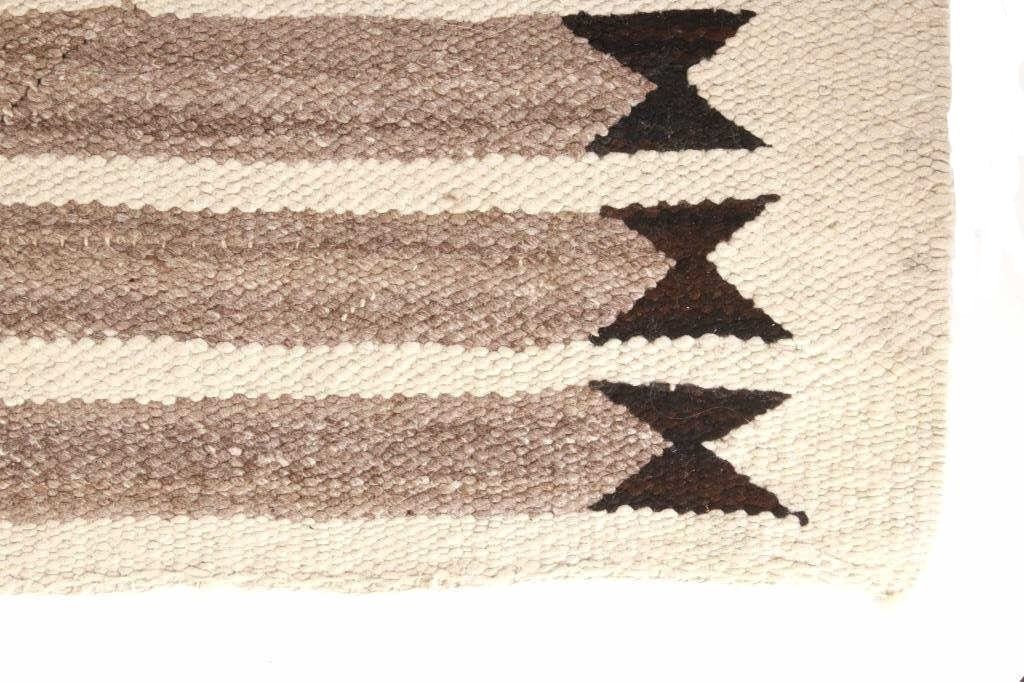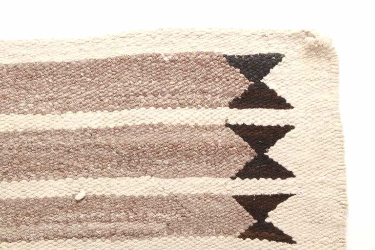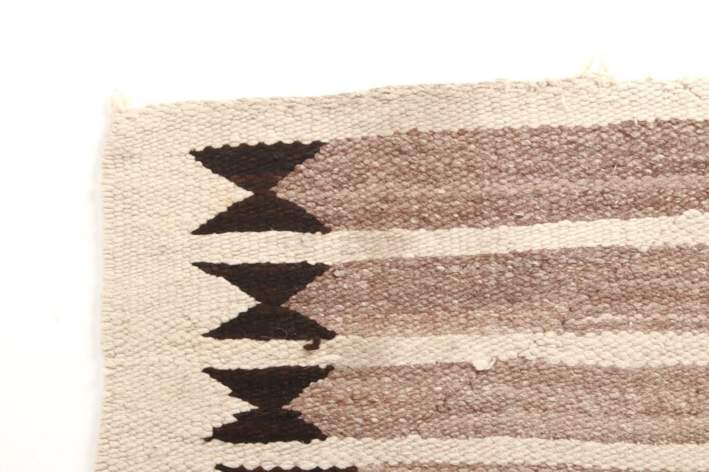 Featured in this lot is this Navajo stepped banded Chinle rug circa 1950's. The rug features a beautifully crafted Chile design with dark brown stepped decoration of the bands of light brown and all shown on a field of cream. This regional Navajo Rug style is named for the town of Chinle at the mouth of Canyon de Chelly. The Chinle style was developed by Mary Cabot Wheelwright and Cozy McSparron, a trader at Chinle. They sought to revive weaving using classic period designs with vegetal dyes. The condition of this rug is fair to good with some wear to the edges of the rug with two small holes in the weaving due to age and use but otherwise in fair to good overall condition; there is also only two present tassels with some wear and the other two missing. The measurements of this rug are 62" x 35". This is a large rug with thickly woven construction.
