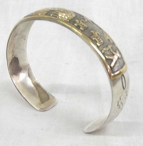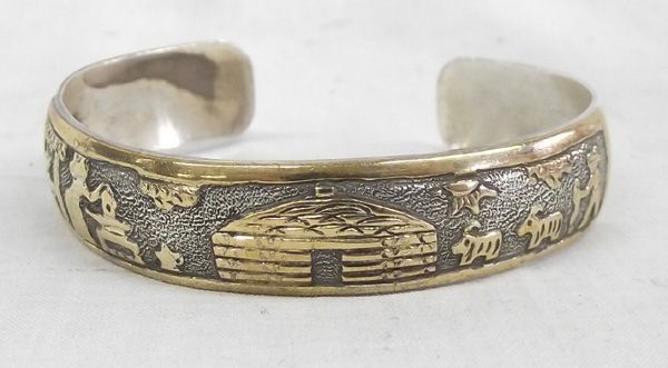 Navajo Gold on Sterling Hogan Storyteller Bracelet, measures approx. 6 1/4'' inside measurement x .5''W