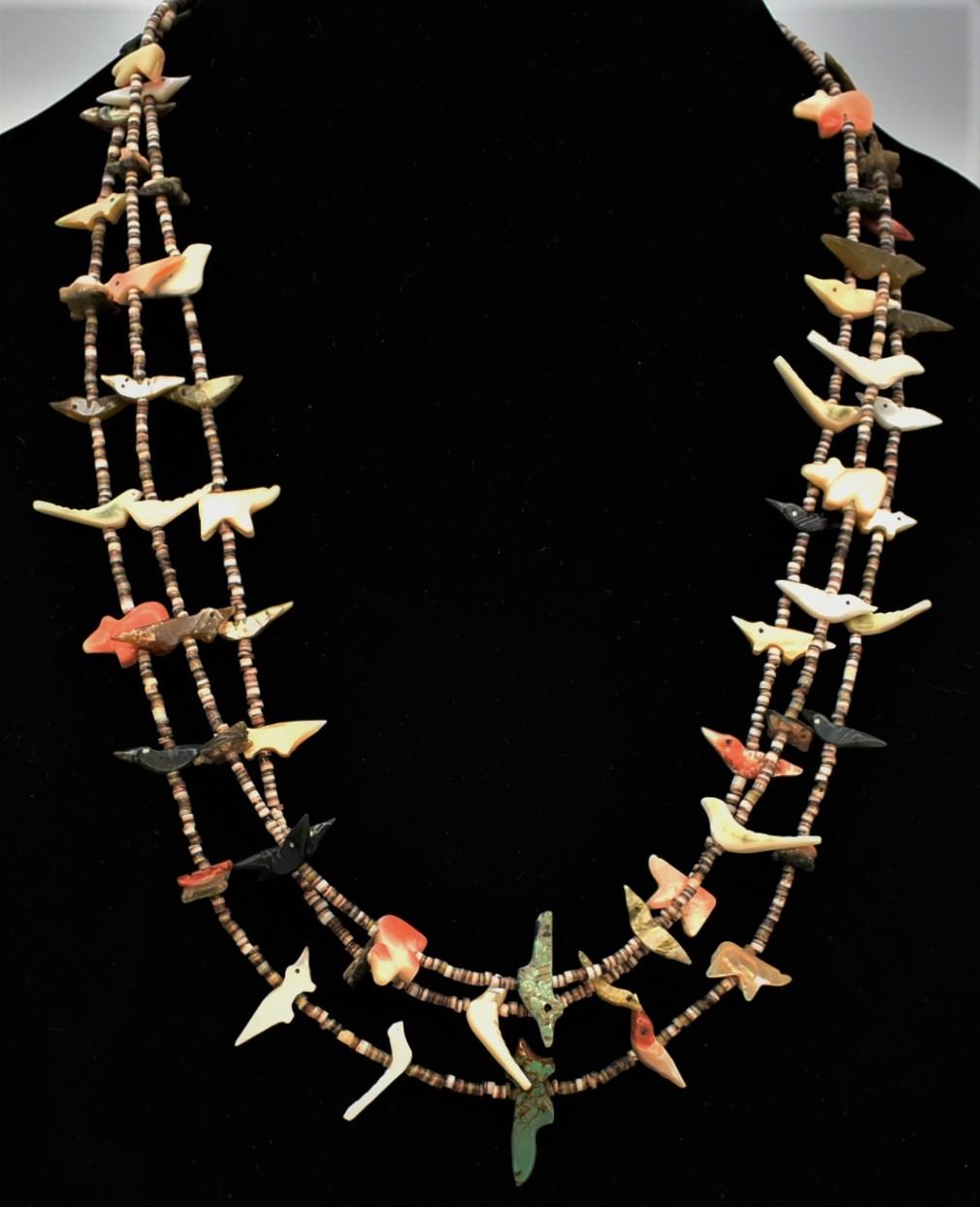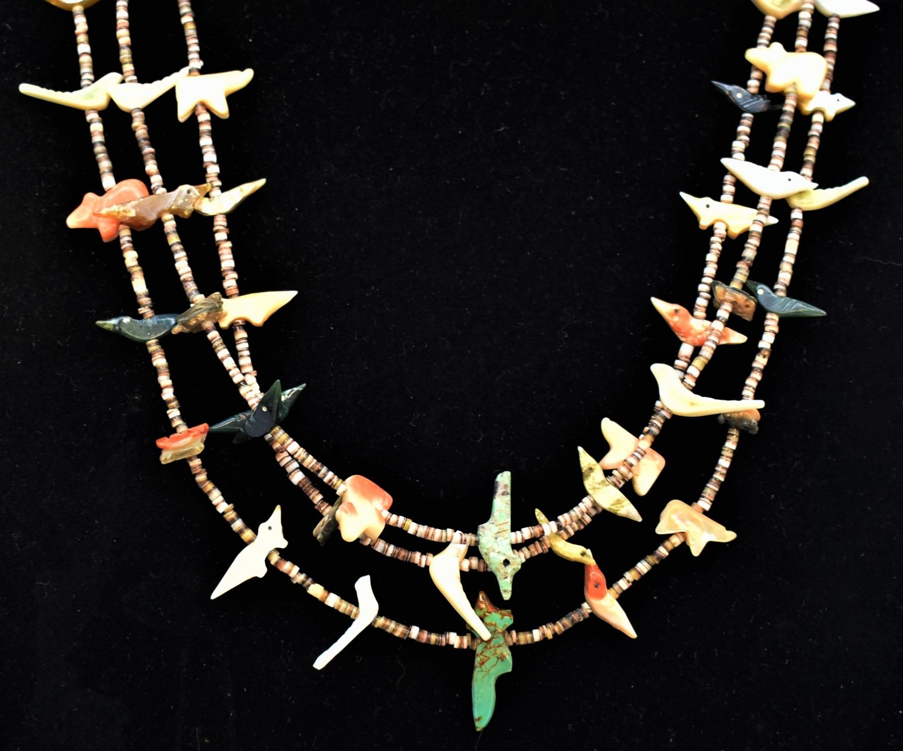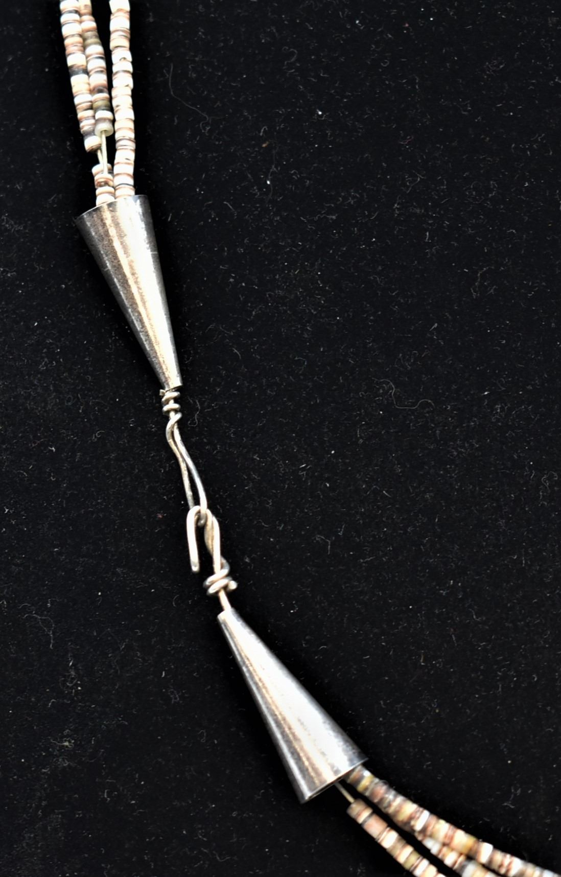 Native American Navajo Sterling 3 Strand Fetish Necklace, sterling cones and hand crafted hook and eye clasp, beautiful colors of mother of pearl, alabaster, orange shell, picasso marble, jasper, abalone, and more, fine shell heishi spacers, measures 24''L end to end
