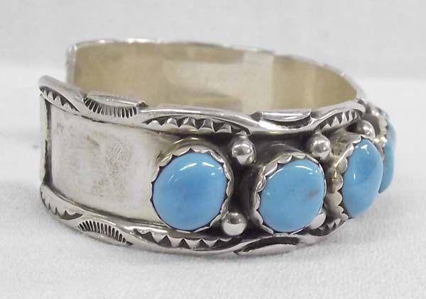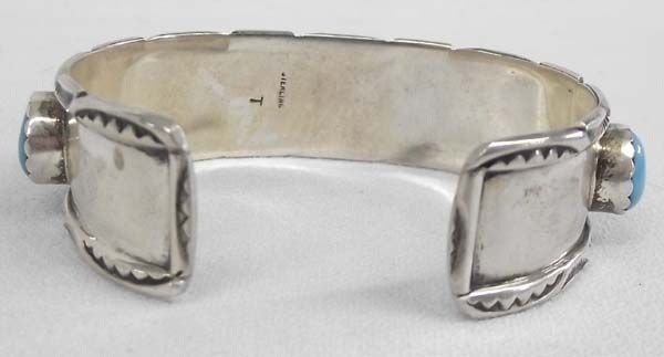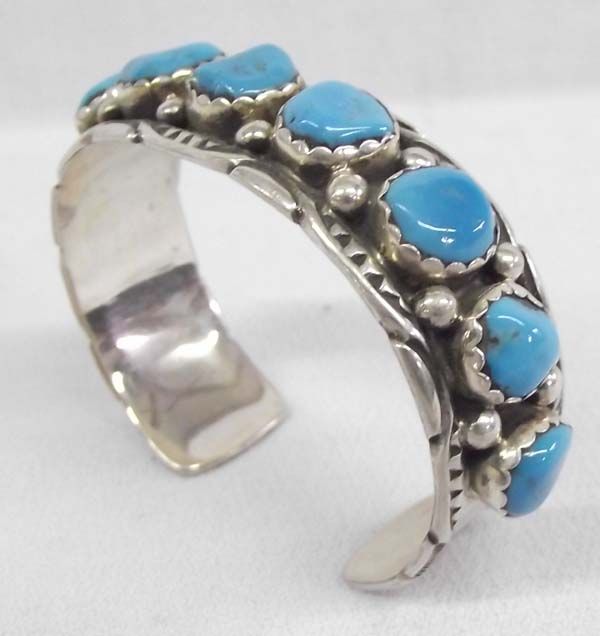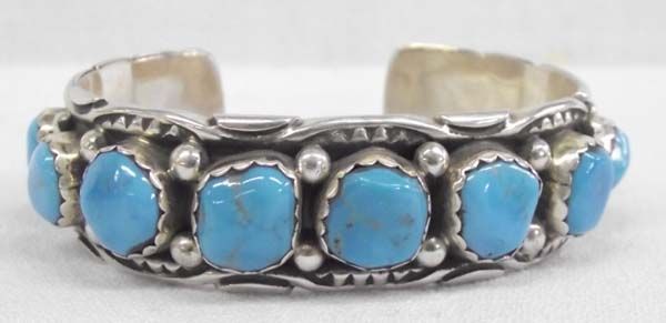 Native American Navajo Sterling 9 Turquoise Nugget Bracelet. Beautiful, heavy sterling bracelet with 9 graduated size turquoise nuggets. The bracelet is stamped on the inside, ''Sterling'' and with the artist's hallmark, ''T''. It measures 6-7/8'' inside including the opening and is 1.25''W.
