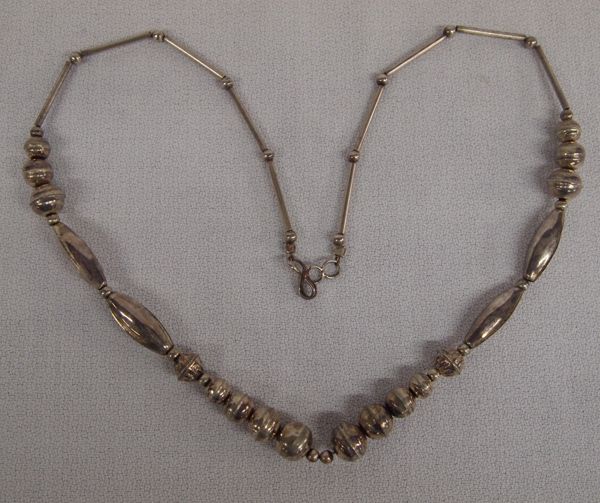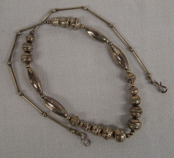 Navajo Sterling Bead Necklace, measures 18'' end to end, melon and spherical beads, hook clasp, wire strung, 18.38g in total wt.