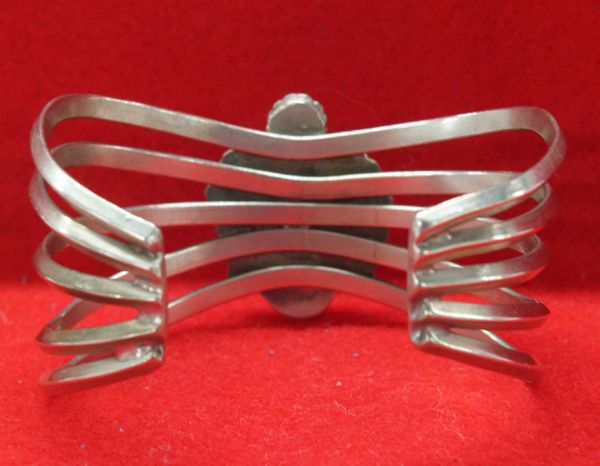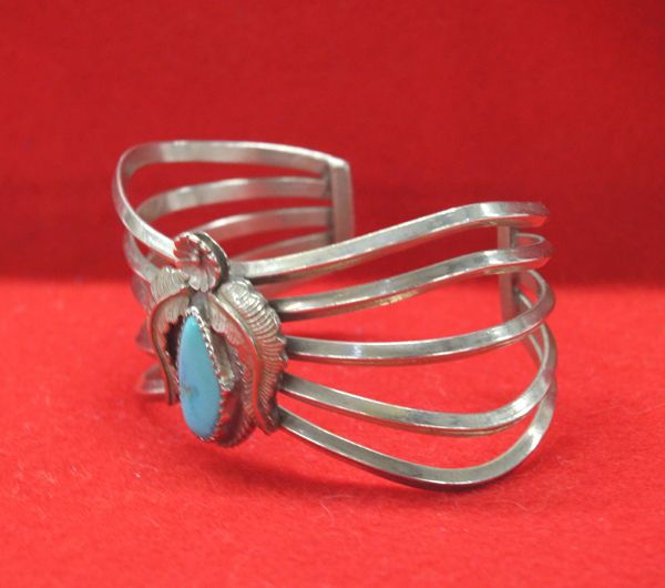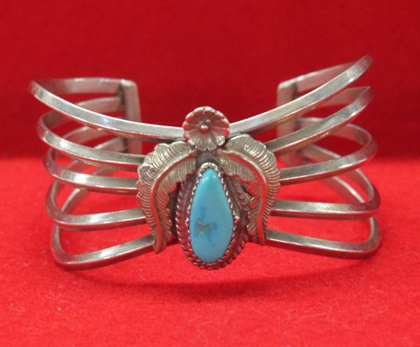 Navajo Sterling Bisbee Blue Turquoise Bracelet, inside measures 6.5'' which includes opening x 1.5'' at widest section, traditional style setting of leaf and flower motif, features bright sawtooth bezel set Bisbee Blue cabochon measuring .75''L x 3/16''W, unique 5 band bracelet, 40.75g in total wt.