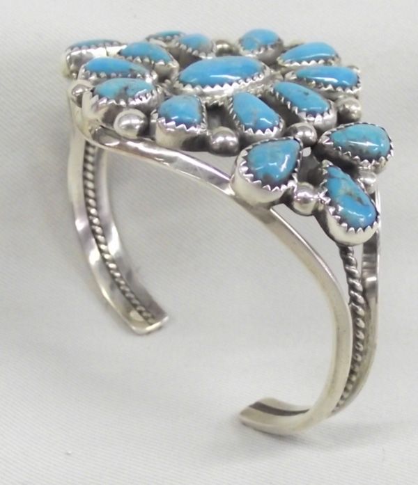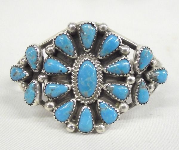 Navajo Bisbee Turquoise Sterling Bracelet. Silversmith/lapidarist Mike Platero is the artist of this fine piece. Measures 6''. Top is 1-1/2''H, 2-1/4''W, 28'' grams. Turquoise is stunning in its tear drop shape with silver beading. Signed.