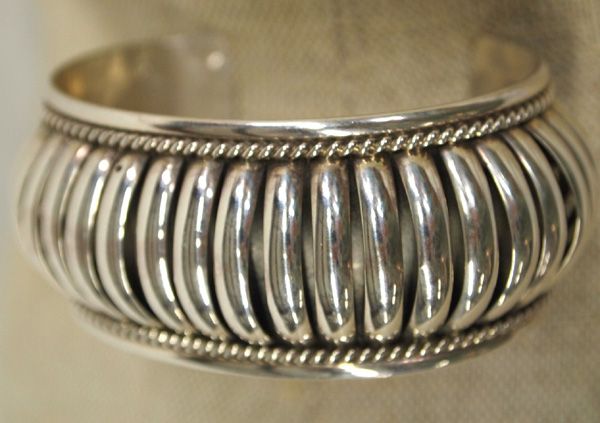 Navajo Sterling Bracelet-Pricilla Apache. Wrist measurement 6 3/8'' x 2''W. Hallmarked and stamped sterling. The silver vertical bans actually are bent and hollow underneath help to lighten the bracelet weight. Gorgeous shine and look.