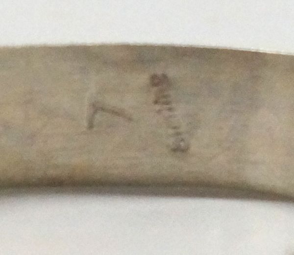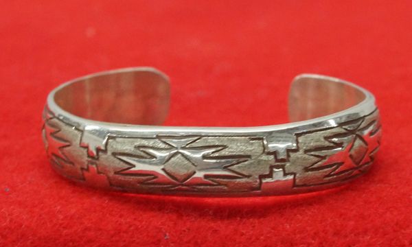 Navajo Sterling Bracelet by Travis Largo, inside measures 4.5'' which includes opening x 3/8''W, beautifully carved butterfly symbols, hallmarked with a slanted T and stamped sterling, 10.51g in total wt.