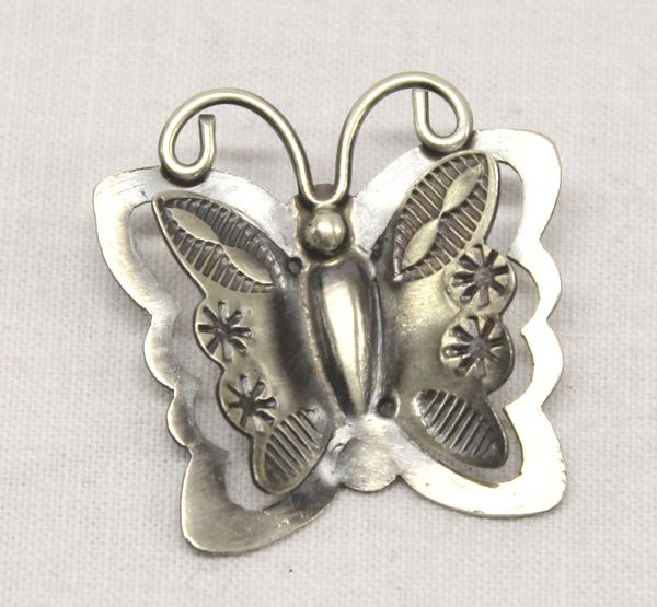 Navajo Sterling Butterfly Pendant Signed. Sweet brushed sterling silver dimensional butterfly pendant, signed by the hallmark for Tim Yazzie. It measures 1'' x 1 1/8''.