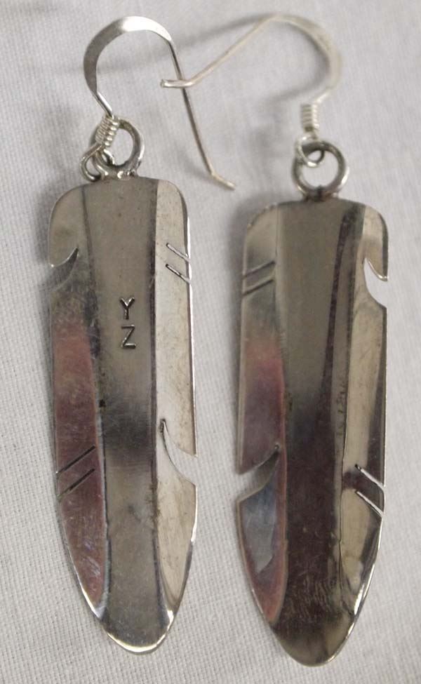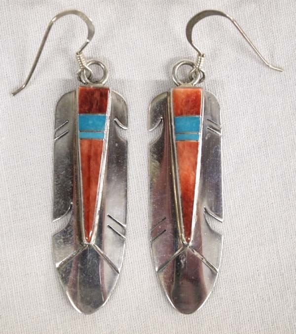 Gorgeous Native American Navajo Sterling Channel Inlay Earrings by Marilyn Yazzie, turquoise and red shell channel inlay, measure 2''L x .5''W, hallmarked YZ, 6.13g in total wt.