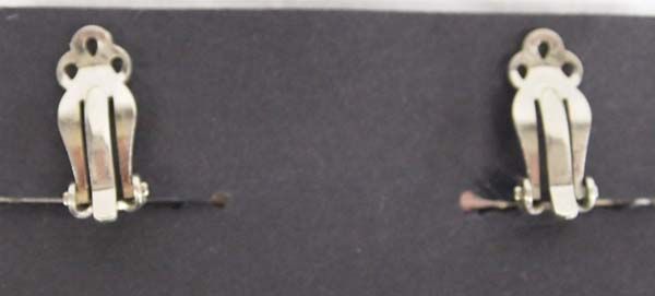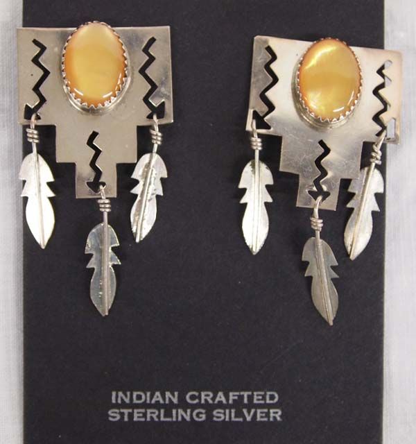 Navajo Sterling Chatoyant Quartz Clip-On Earrings, measure 2''L x 1''W, each earring features cutaway lightning designs, sterling feather dangles, and a 7/16'' x .5'' bezel set chatoyant quartz cabochon, 7.66g in total wt.