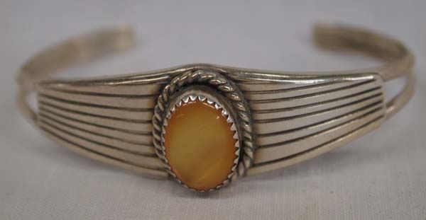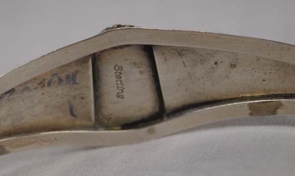 Navajo Sterling Chatoyant Quartz Cuff Bracelet, inside measures 6.5'' which includes opening x .75''W, sawtooth bezel set Chatoyant Quartz cabochon measures .5'' x 5/16'', carved silver accents, stamped sterling, 11.7g in total wt.