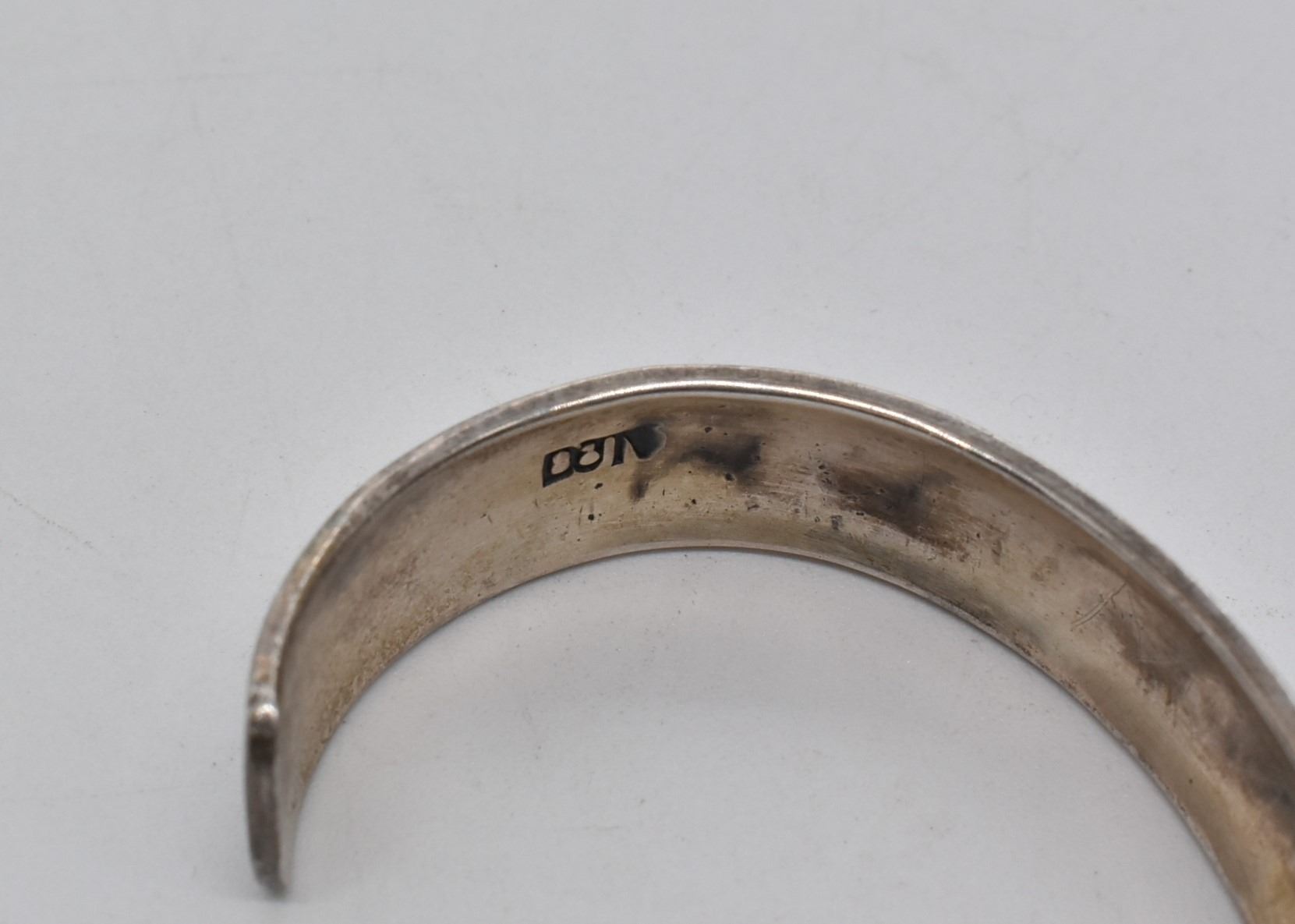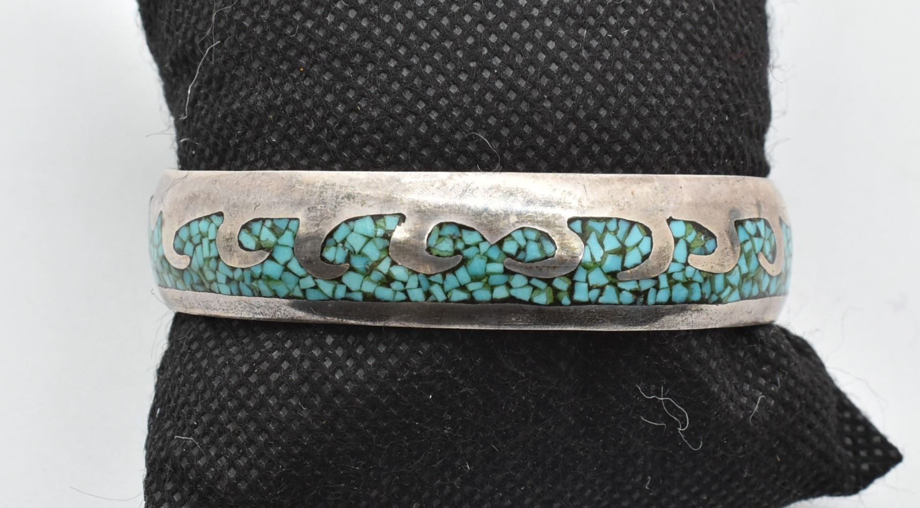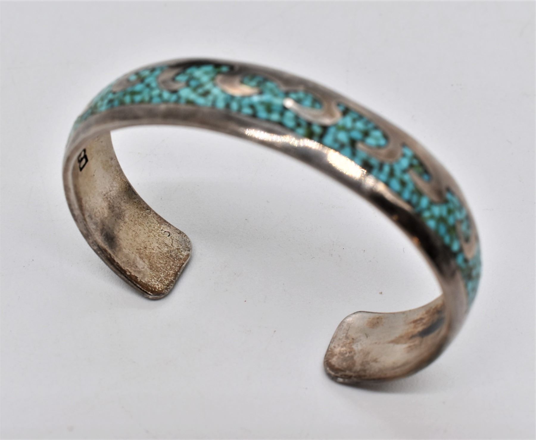 Native American Navajo Sterling Chip Inlay Turquoise Bracelet by Delvin Nelson, hallmarked, inside measures 6'' which includes the gap x .5''W, total gram wt. of 28.3