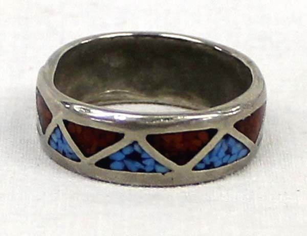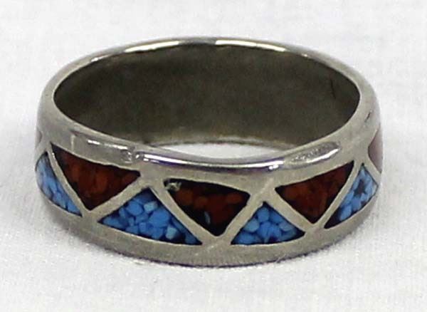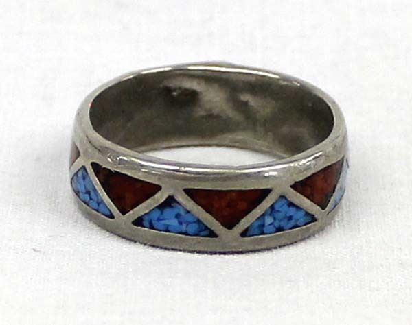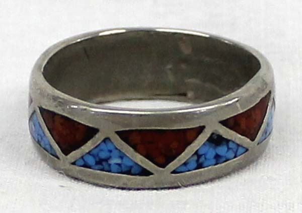 Native American Navajo Sterling Chip Inlay Turquoise Coral Ring, Size 7.5, measures .25''W