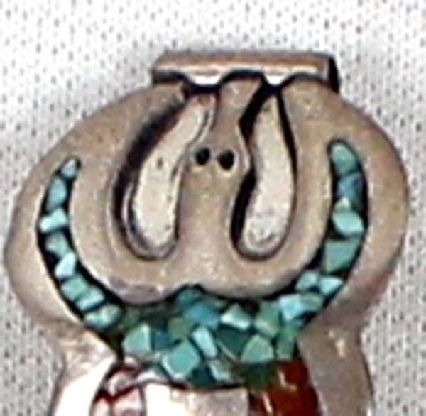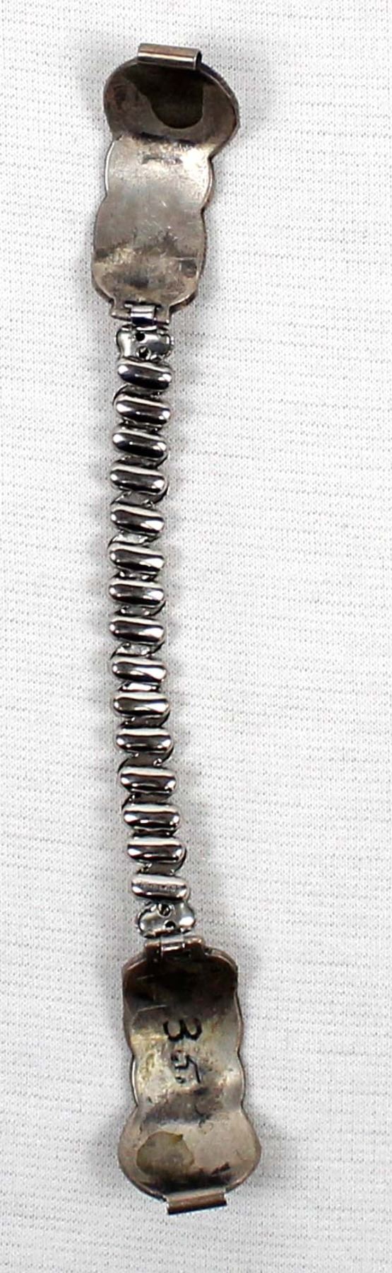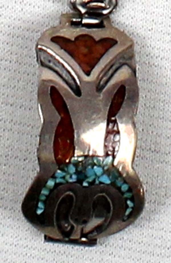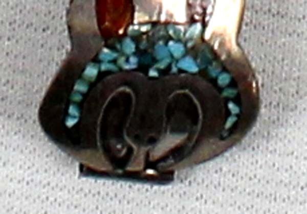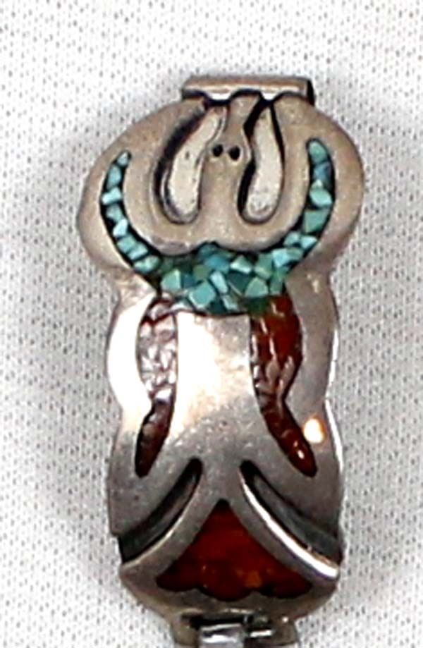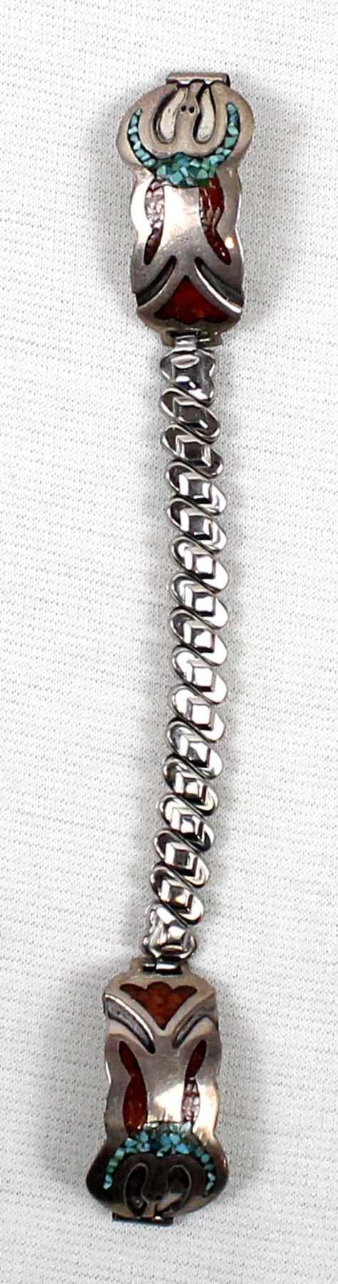 Native American Navajo Sterling Chip Inlay Turquoise and Coral Peyote Bird Watch Band, tips measure .5'' x 1'', engraved I on both tips