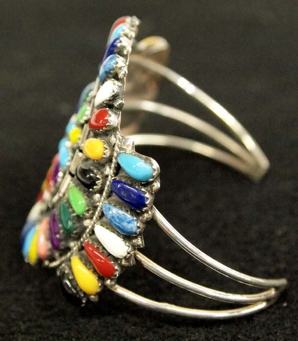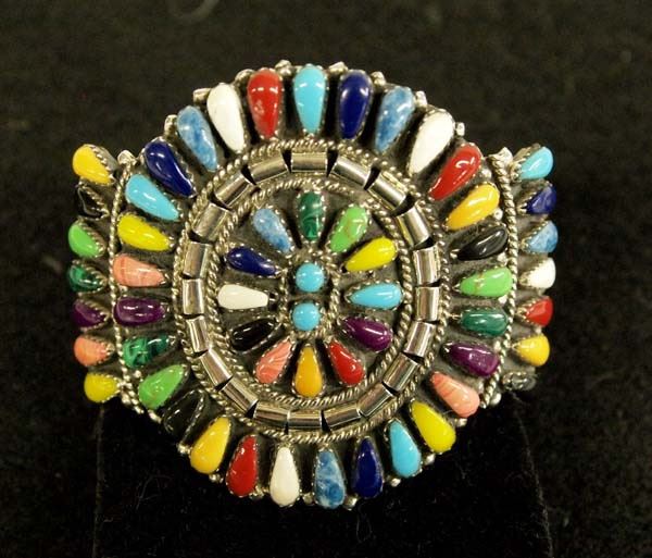 Native American Navajo Sterling Silver Cluster Bracelet by Juliana Williams, inside measures 6.75'' which includes opening x 2.25''W, hallmarked JW and stamped sterling, some of the stones included are: turquoise, denim turquoise, lapis, mother of pearl, coral, onyx, sugilite, gaspeite, malachite, rhodochrosite, and others, 33.9g in total wt.