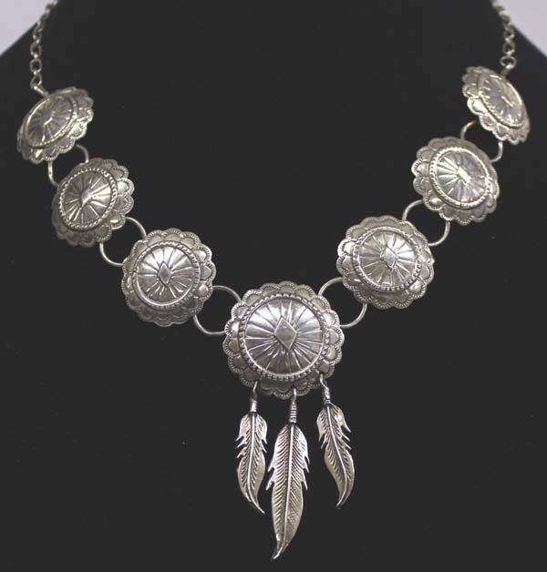 Navajo Sterling Concho Necklace, measures 18'' end to end, largest concho measures 1 1/8''D, comprised of 7 hand stamped conchos and 3 silver feather accents, hand wrought chain, 29.08g in total wt.