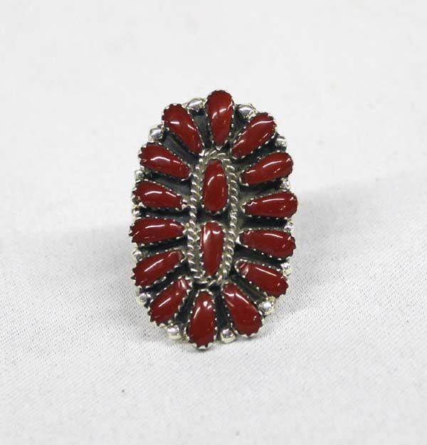 Native American Navajo Sterling & Coral Cluster Ring by Juliana Williams (JW), 16 tear drop shaped blood red coral stones create the cluster design of this ring, the two center stones are encased by a braided silver rope accent, silver beads separate each outer coral stone, size 8, 1.5'' X 7/8''.