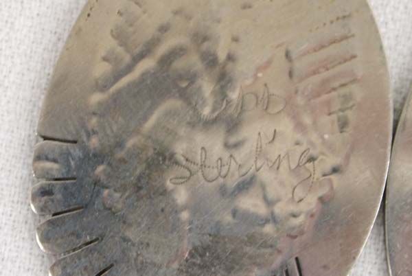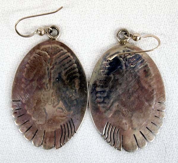 Gorgeous Navajo Sterling Cornstalk Earrings by Montano Gibbson, measure 2''L x 1''W, engraved signature on back Gibb and sterling, beautifully carved silver feather bordering, 16.5g in total wt.