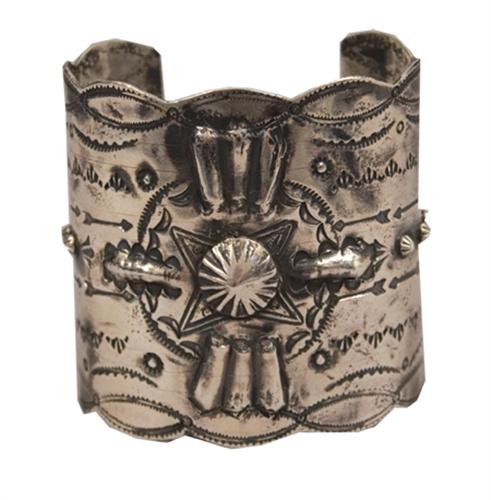 Navajo Sterling Cuff. 3" wide. Nice stamping and repousse work. Early 20th century. (est $600-800)