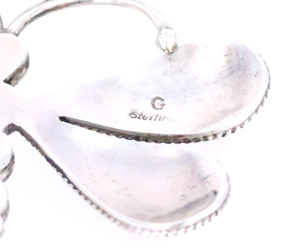 For your consideration this lot features a Vintage Navajo Sterling Dragonfly Pendant by Navajo artist Gilbert Damon, circa 1960s-1970s. The pendant has six (6) red branch coral cabochons with silver beads and twisted rope design, pendant bale has traditional stamped design. The meaning of the Dragonfly symbol was to signify happiness, speed and purity. The dragonfly also represents transformation and life's ever constant process of change. Their first year of life starts in the water as nymphs, then metamorphose, change, into the flying creature we recognize as the dragonfly. The Southwest Indian culture use the term "snake doctor" in reference to a legend that dragonflies follow snakes around and stitch them back together if they are injured. For the Navajo people, the dragonfly is the symbol for pure water. Hallmark "G" and "Sterling" are stamped on the reverse. This beautiful pendant is in very nice condition, measures 2.75"L x 2.25"W, total weight is 20.9 grams.