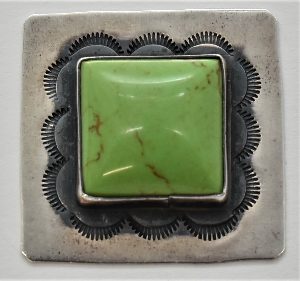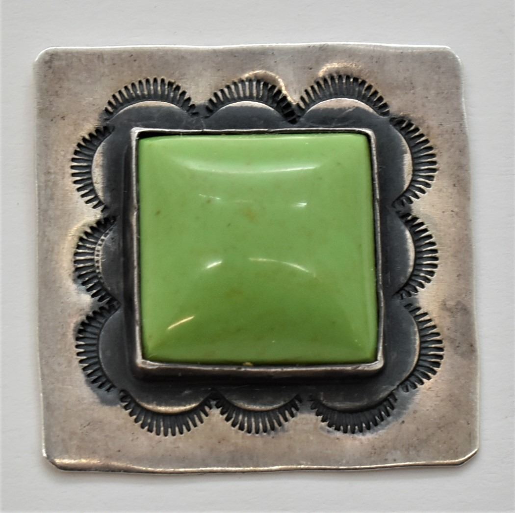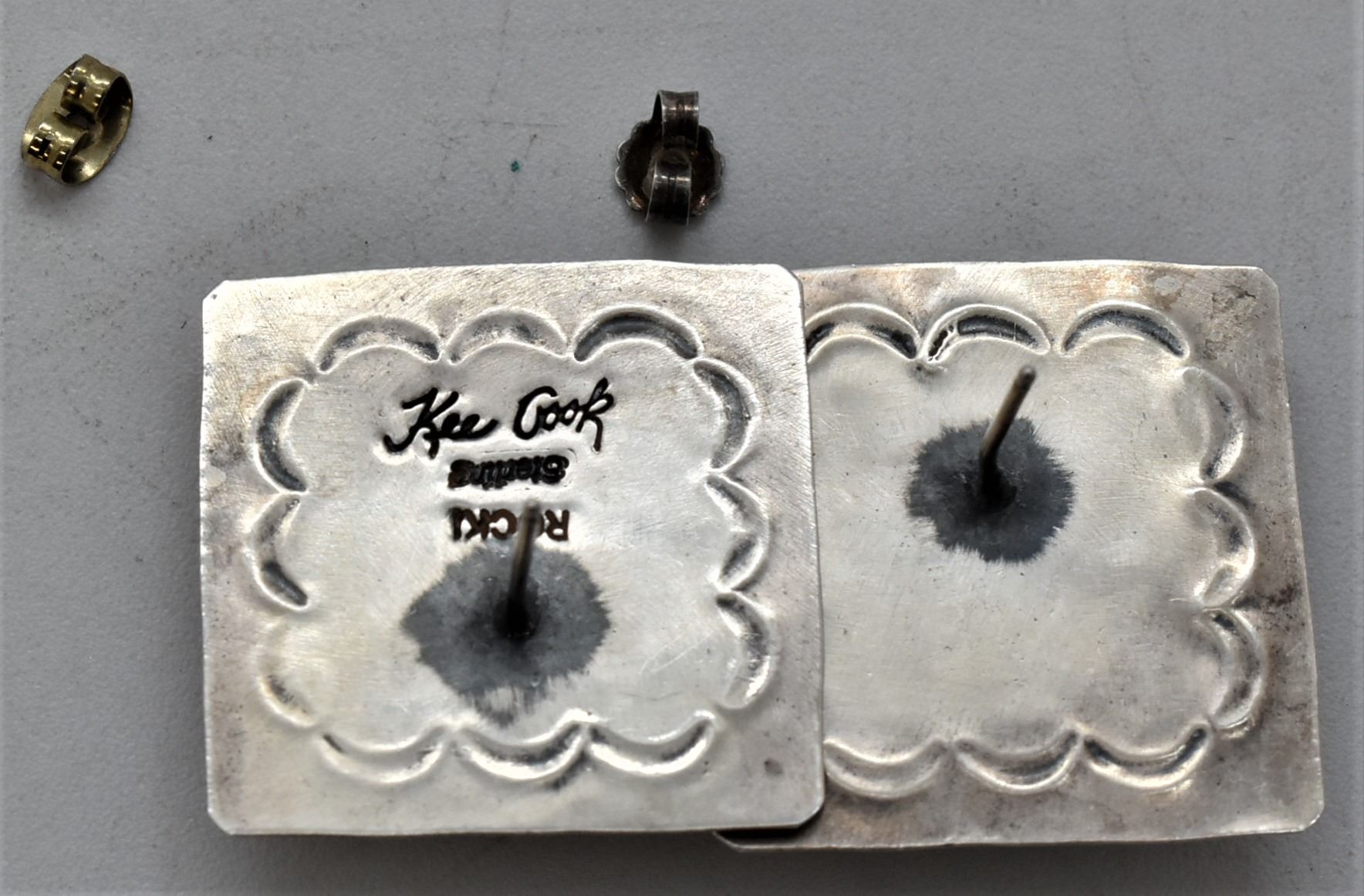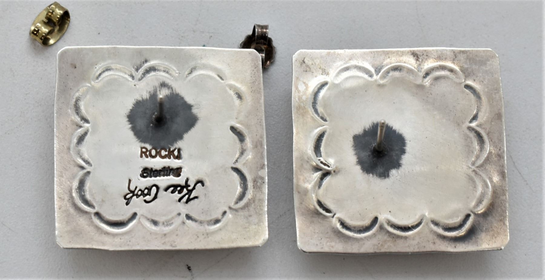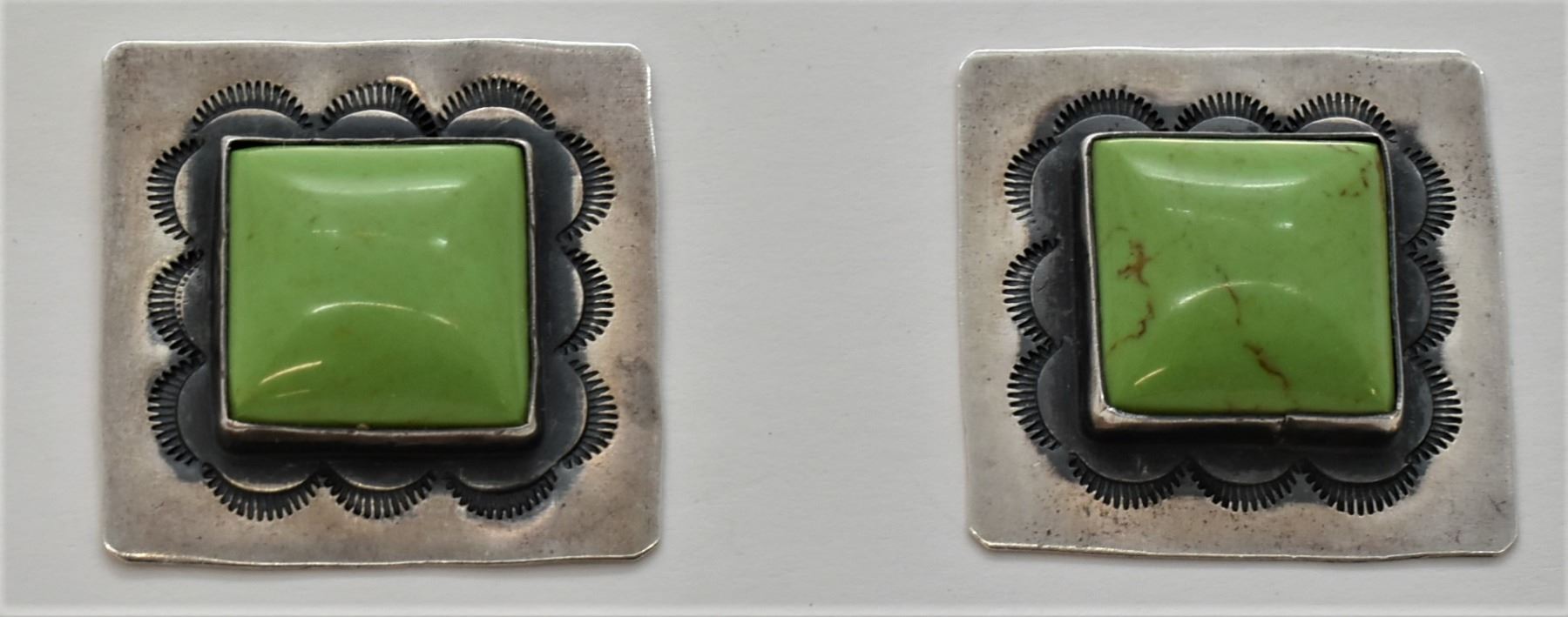 Native American Navajo Sterling Gaspeite Post Earrings by Kee C. Cook for Rocki Gorman Jewelry, measure 1.25'' square, total gram wt. of 6.52, hallmarked and stamped sterling