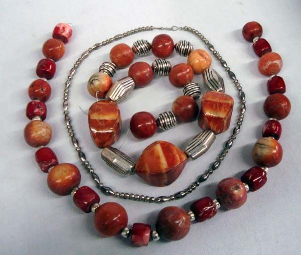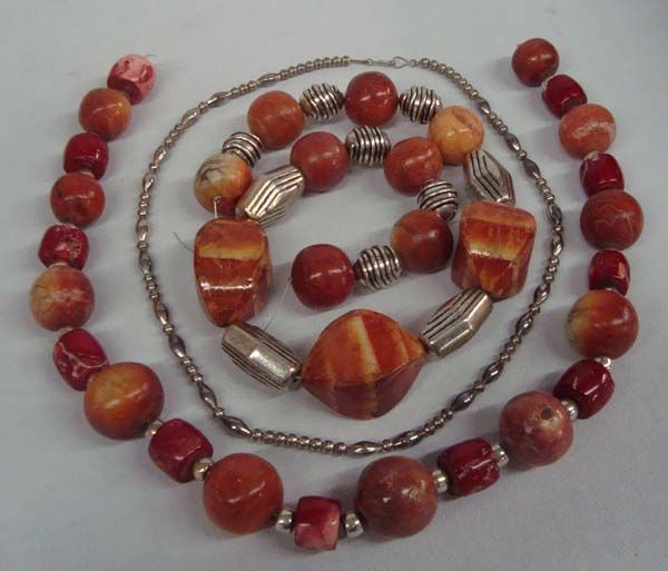 One Hollow Bead Necklace, Two Strands Orange Red Beads. The sterling necklace is 24'' long. The strands of beads are ready to ''make your own'' jewelry. The largest bead is 1.25''wide of reds and oranges.