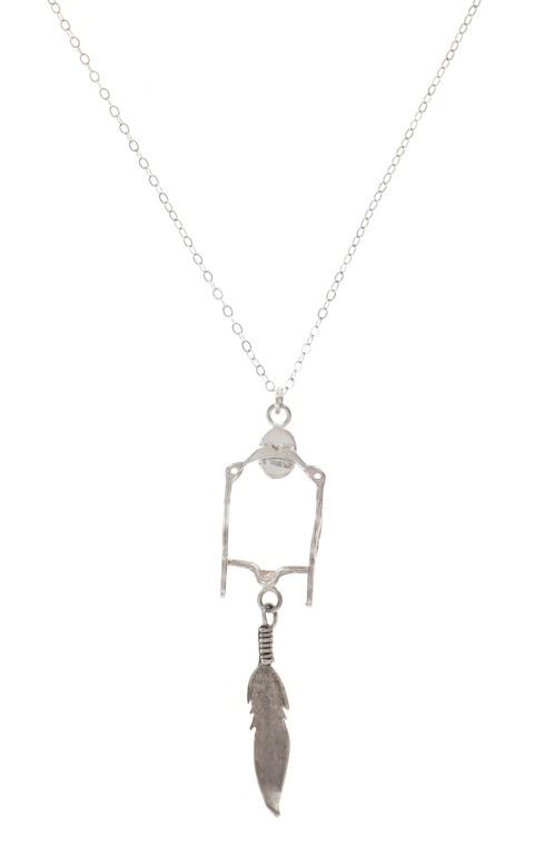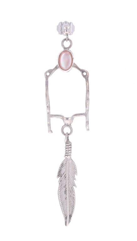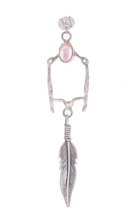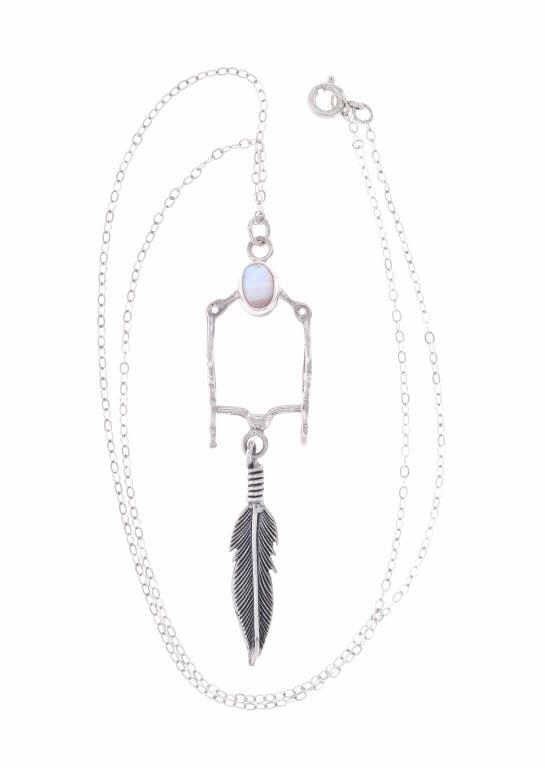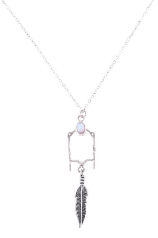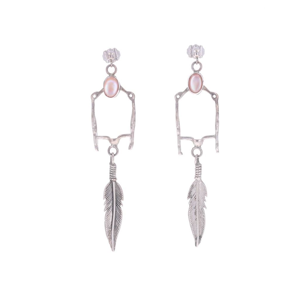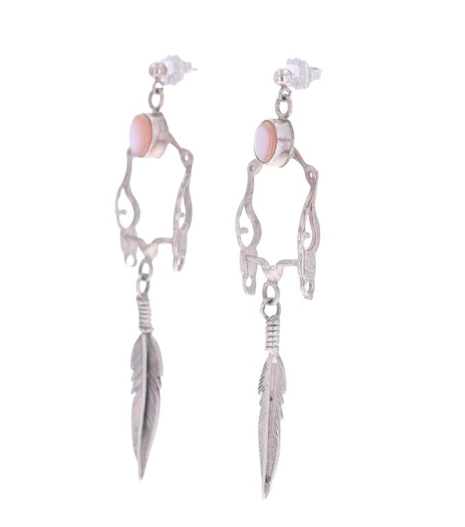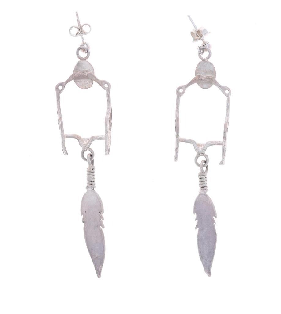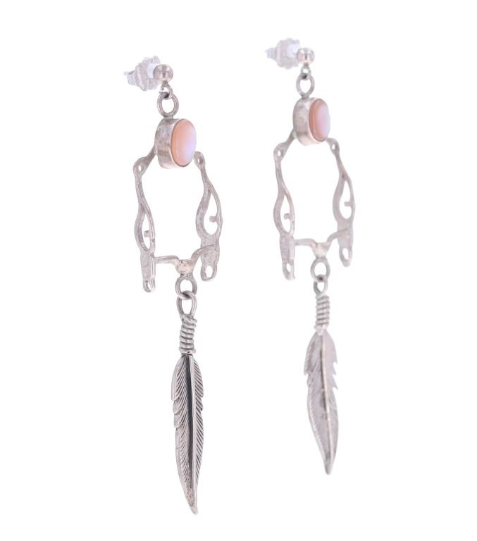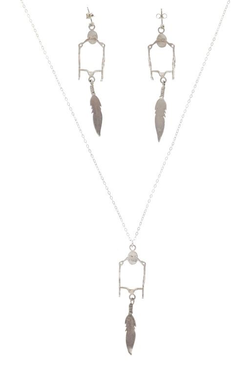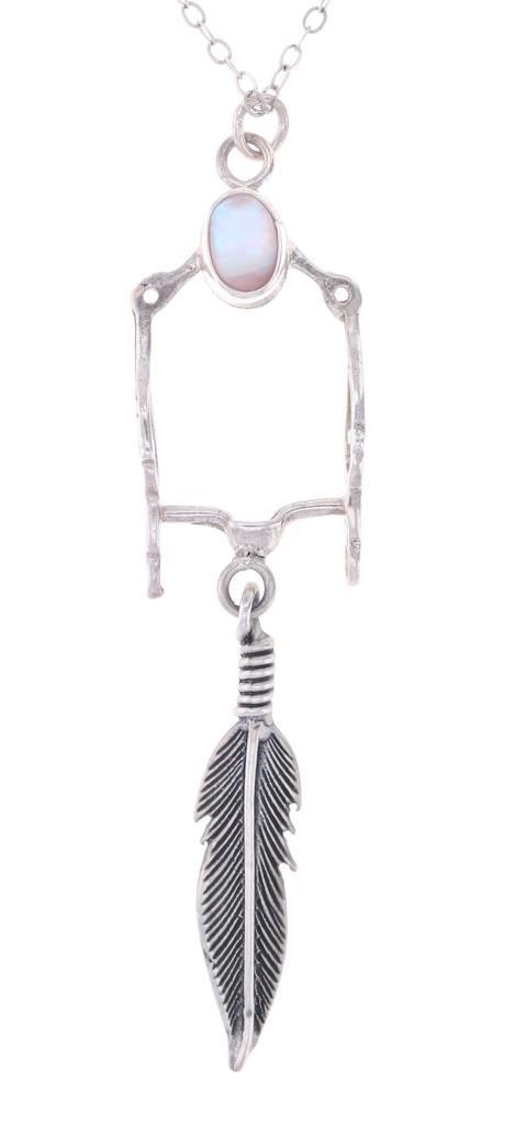 For your consideration is this Navajo made sterling and mother of pearl horse bit necklace and earring set. This set includes a paid of earrings shaped into a horse bit shape with a dangling feather on each. The top of the earring shows a small cabochon of mother of pearl. The necklace features a long chain and shows the same style as the earrings along with another cabochon of mother of pearl situated at the top of the horse bit. The earrings and necklace show good condition overall with no wear or damage present. The earrings measure 2 5/8" L x 9/16" W, while the necklace measures 18" from clasp to clasp and the pendant measures 2 5/8" L x 9/16" W. The pieces have a collective weight of 9.6 grams.