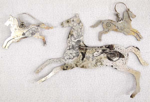 Navajo Sterling Horses Pin and Earrings, all sterling silver, acid etched to give them the look of pinto horses, the large pin measures 3.25'' x 2.5'' and earrings measure 1'' x 1.5'', hallmarked C and stamped sterling, 5.09g in total wt.