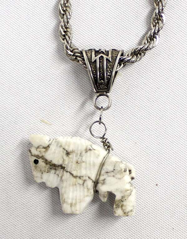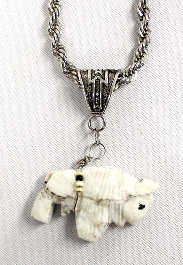 Native American Navajo Sterling & Carved Howlite Buffalo Fetish Necklace, large bale, heavy sterling silver rope chain measures 19''L end to end, fetish pendant measures 2'' x 1.5'', chain itself has a total wt. of 31.23'' and is marked 14K GP