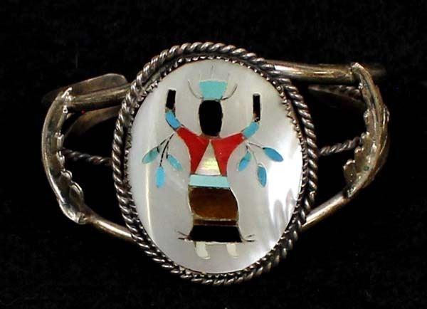 Native American Navajo Old Pawn Sterling Inlay Crown Dancer Bracelet, inside measures 6'' which includes the gap x 1.75''L x 1.5''W
