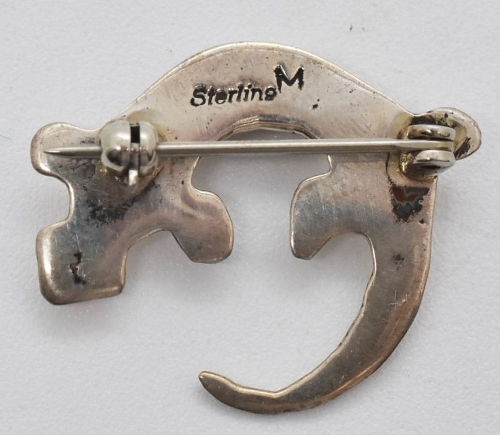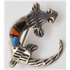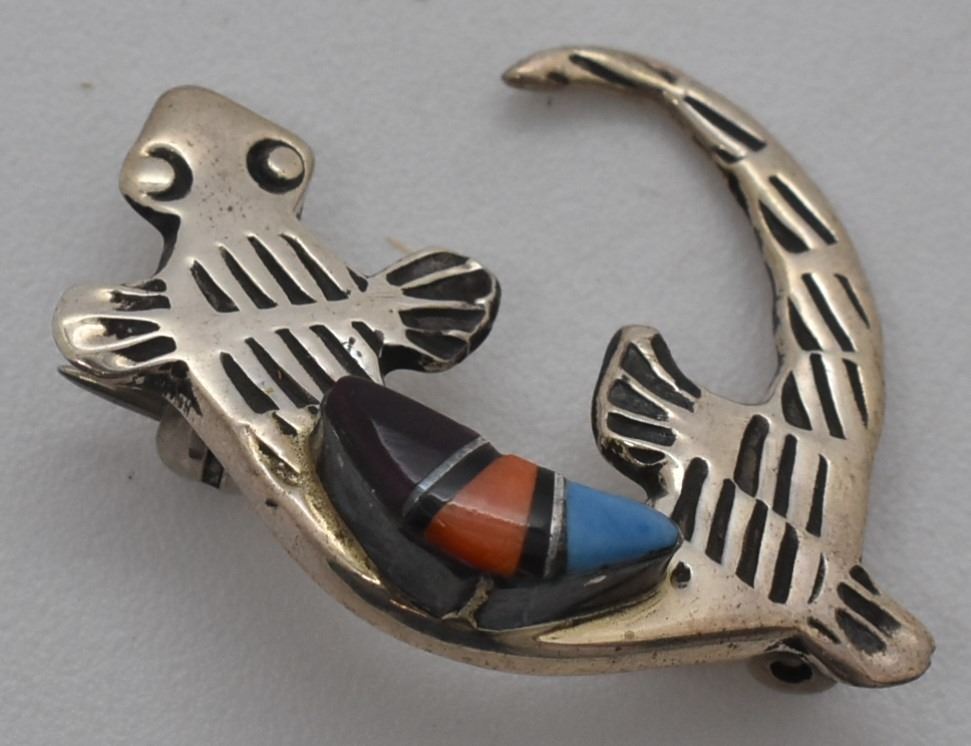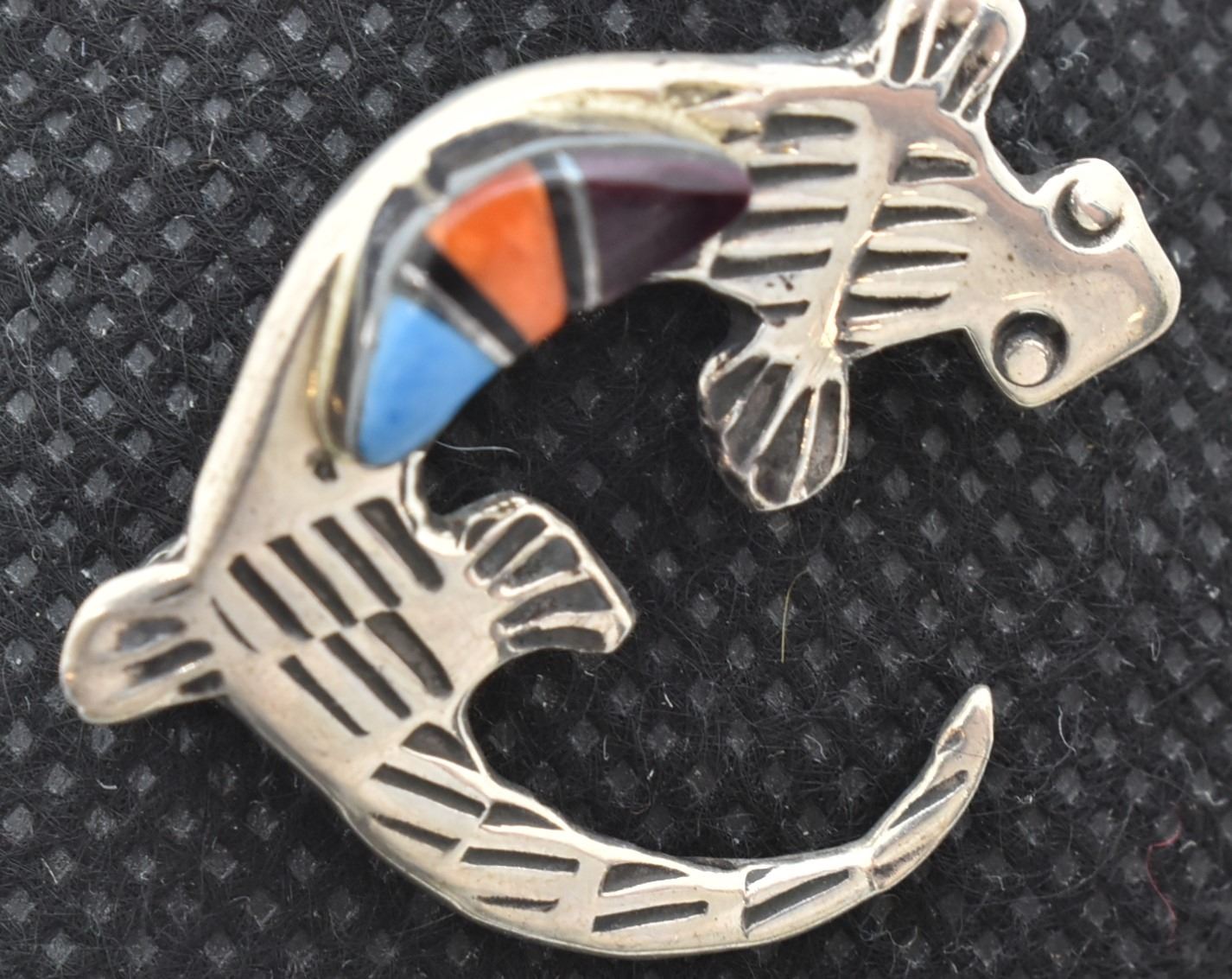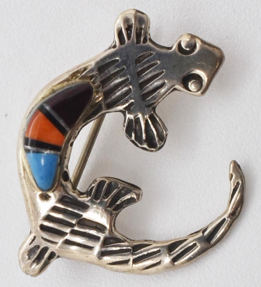 Native American Navajo Sterling Inlay Lizard Pin by Wilbur Muskett Jr, measures 1.25''L, stamped sterling and hallmarked M