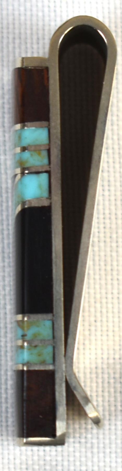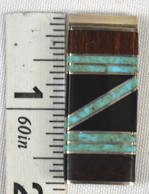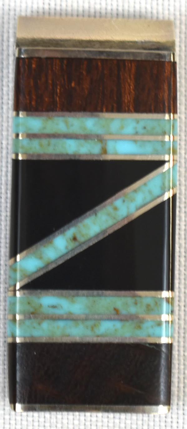Native American Navajo Sterling Inlay Money Clip by Richard Chischilly, measures 1.75'' x .75'', made of turquoise, jet, and desert ironwood, note that the clip itself is not sterling, however the top is, truly a beautiful clip