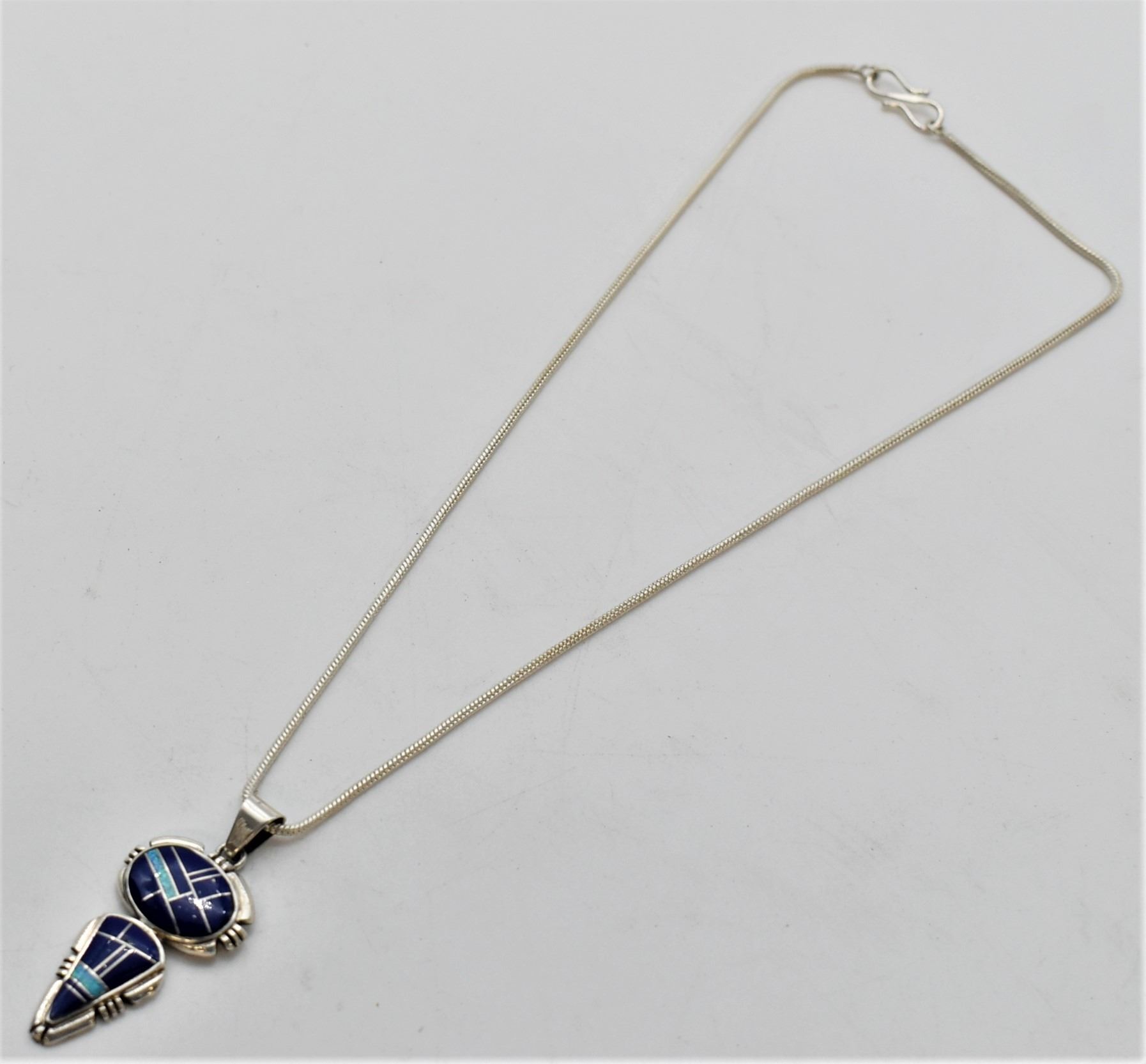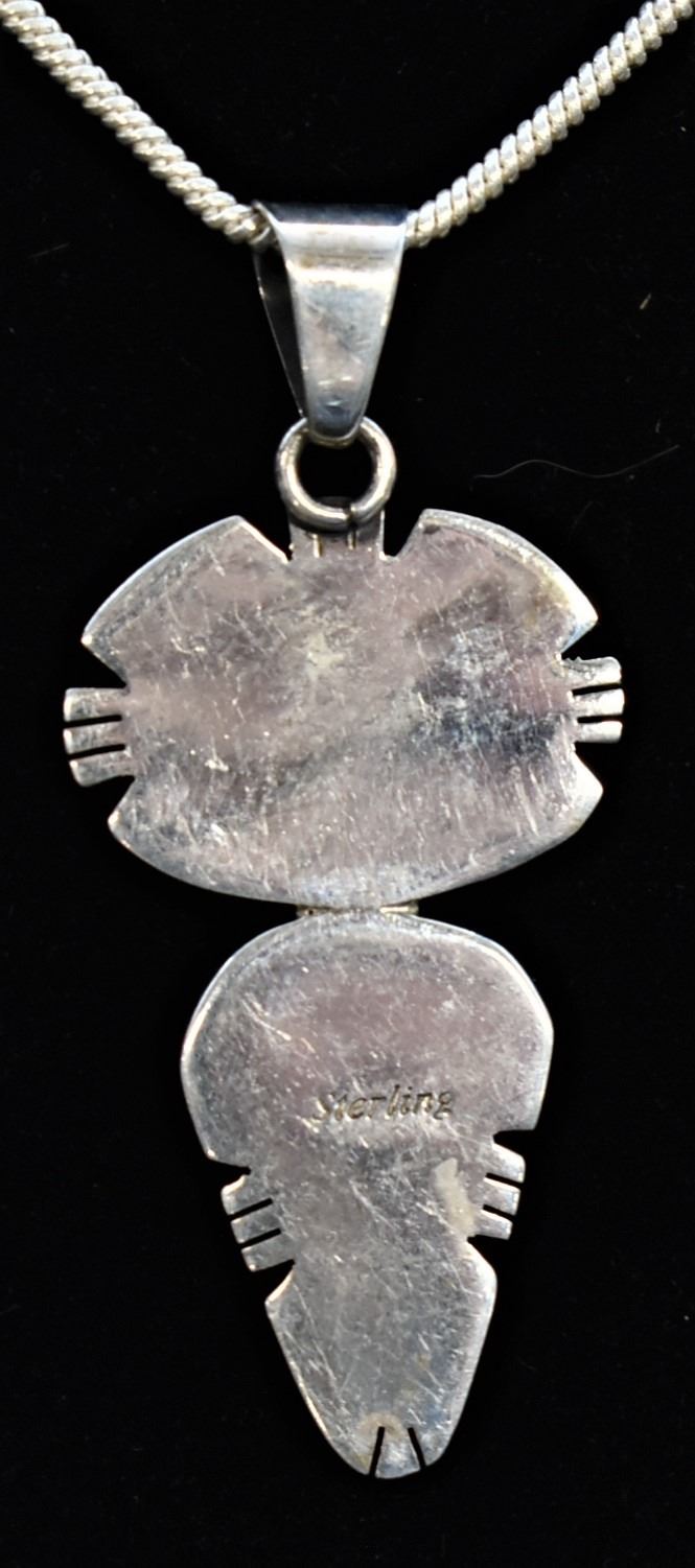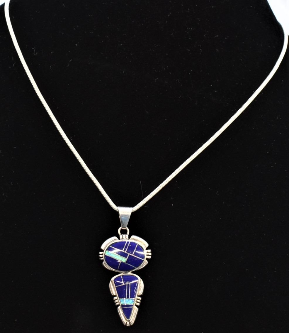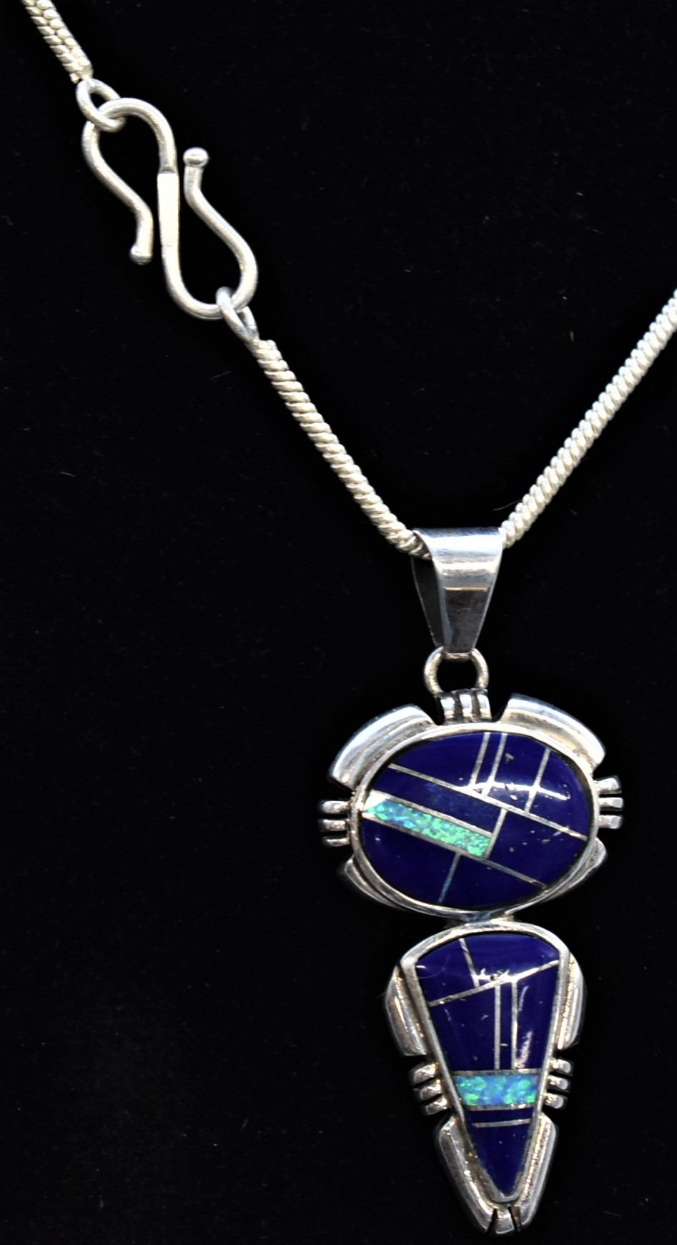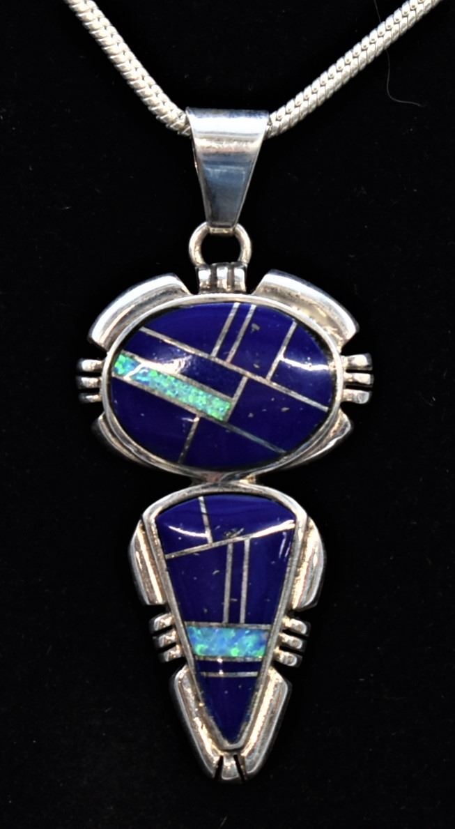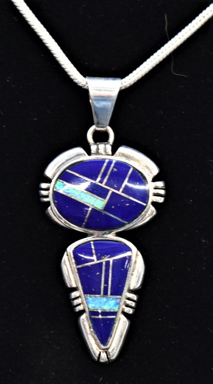 Native American Navajo Sterling Inlay Pendant Necklace, pendant measures 2''L which includes the bale x .75''W and is stamped sterling, channel inlay includes opal and lapis, sterling chain measures 18''L end to end, this pendant resembles Albert Francisco's work, however it is not hallmarked