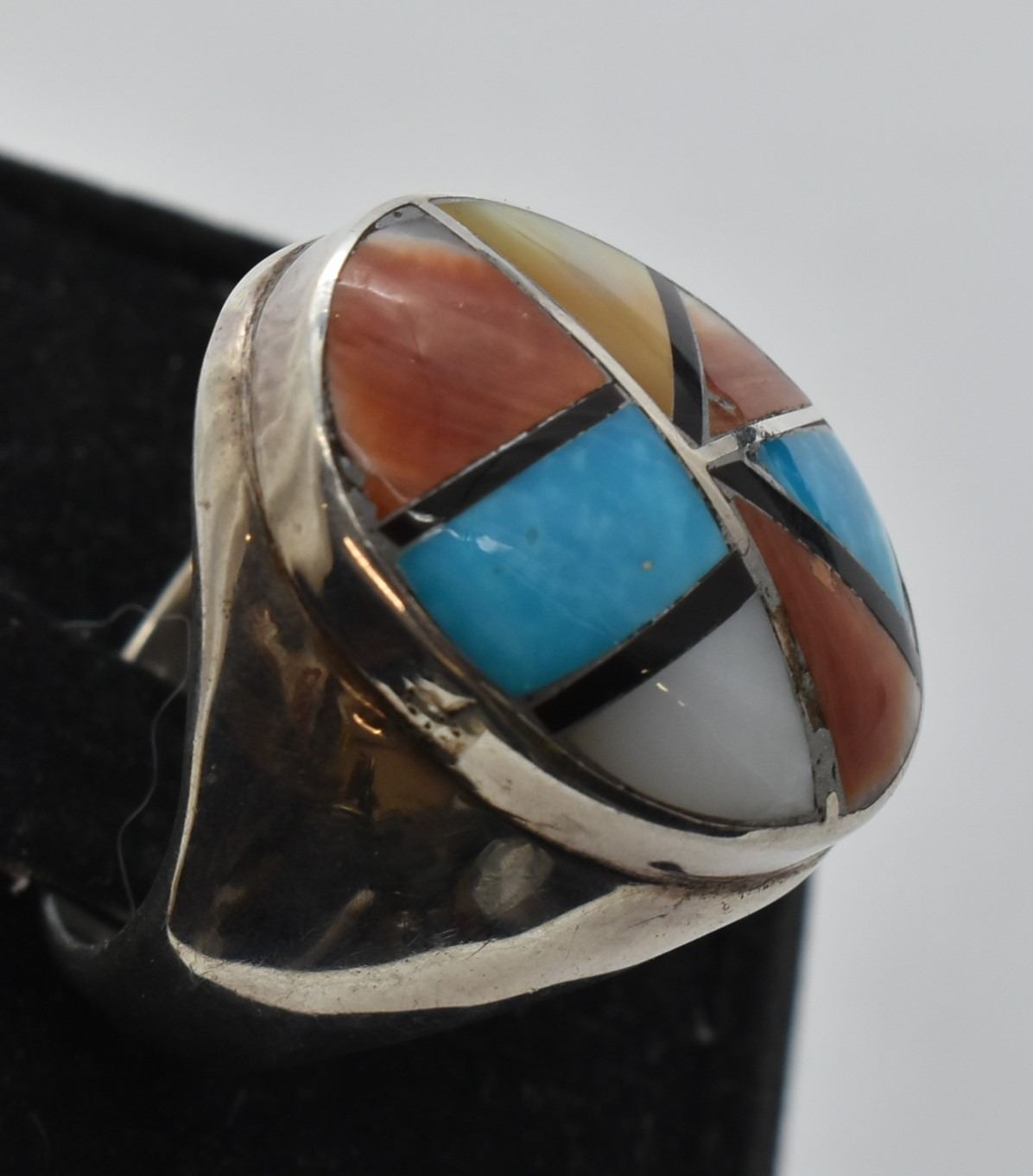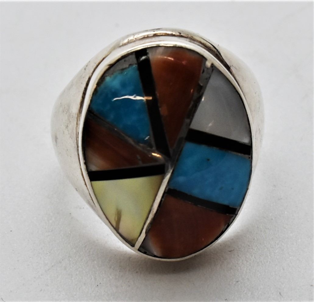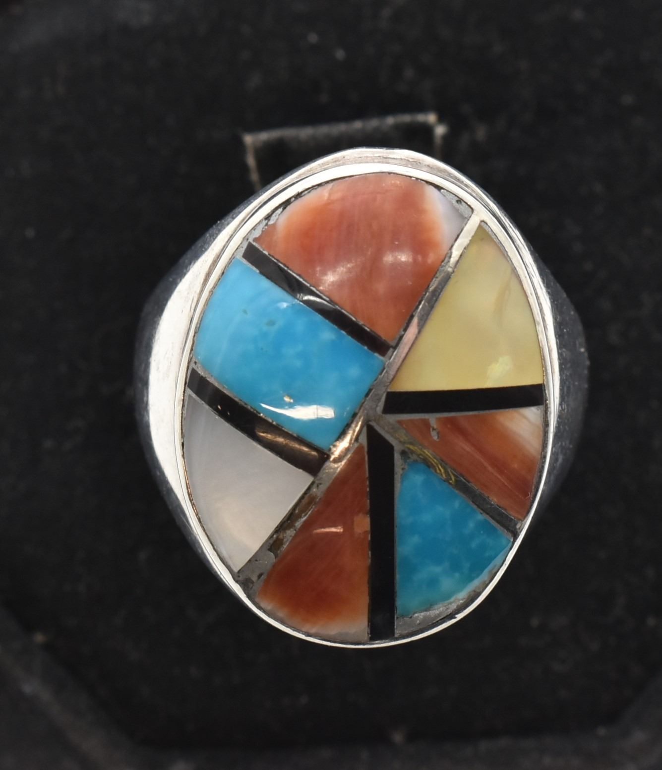 Native American Navajo Sterling Inlay Ring, Size 11.5, measures 1'' x .75'', inlay includes red shell, turquoise, mother of pearl, and gold lip shell, total gram wt. of 23.8