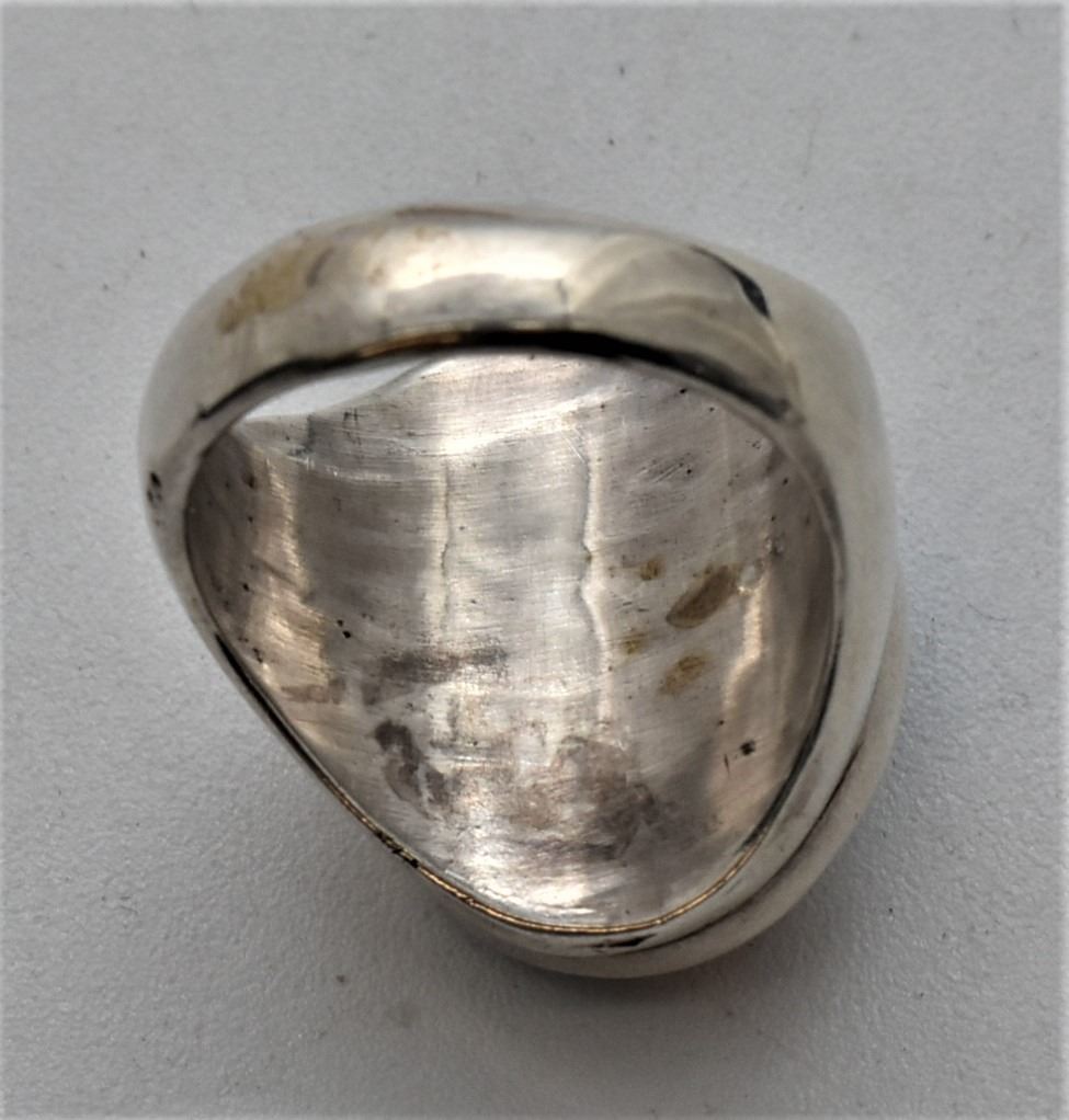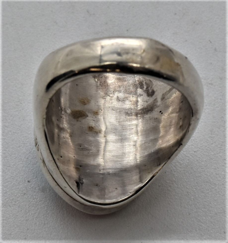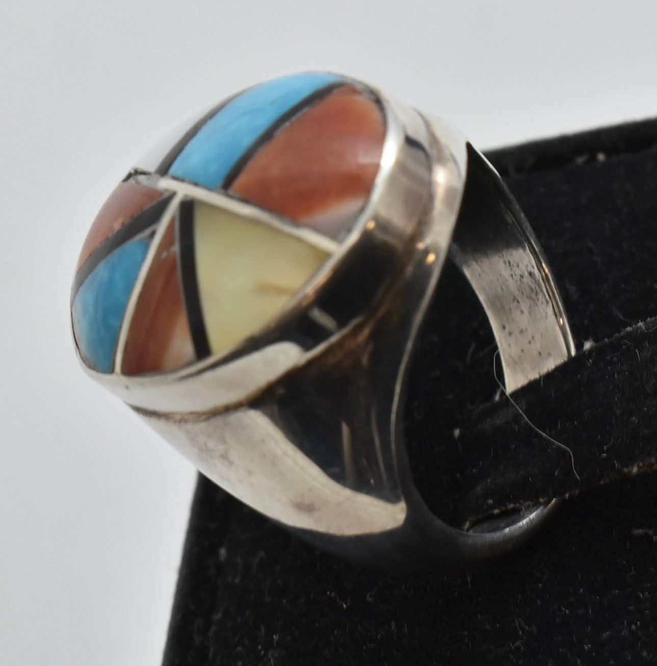 Native American Navajo Sterling Inlay Ring, Size 11.5, measures 1'' x .75'', inlay includes red shell, turquoise, mother of pearl, and gold lip shell, total gram wt. of 23.8