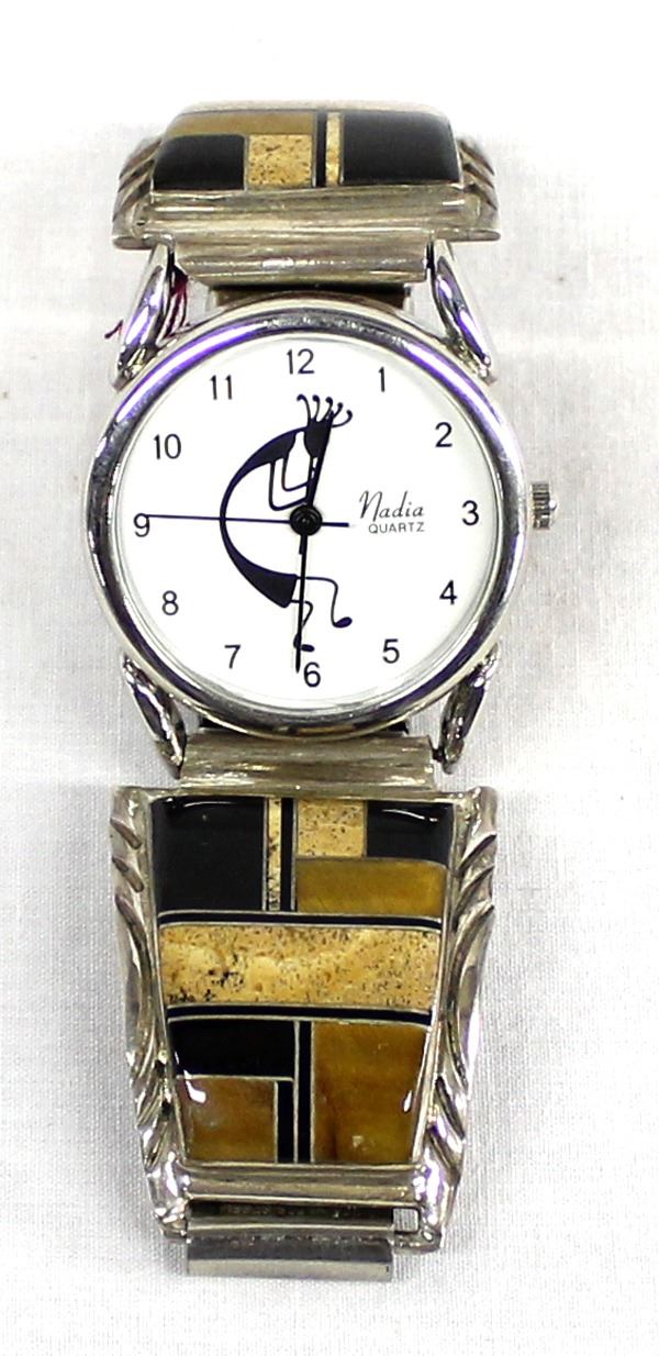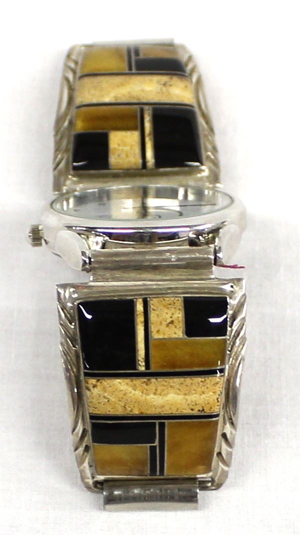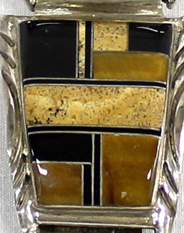 Native American Navajo Sterling Inlay Watch Band by Ray Francisco, tips measure 1.5'' x 1'', hallmarked and stamped sterling, beautiful inlay of jasper, tiger's eye, and jet