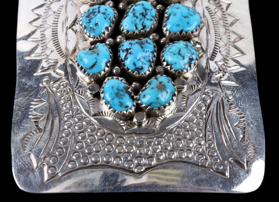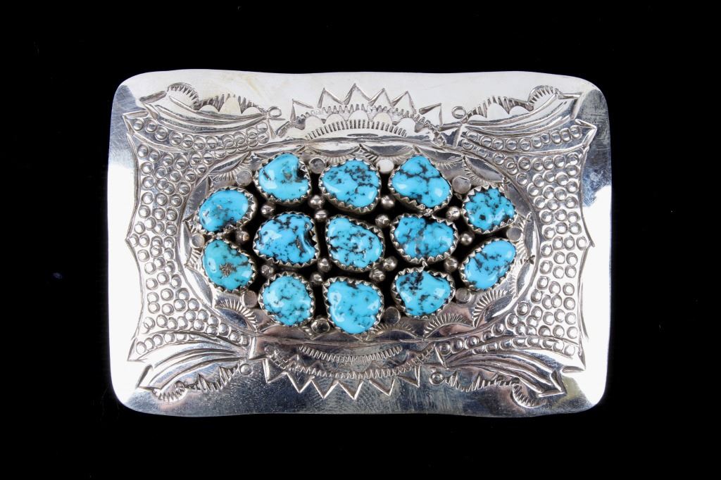 For your consideration is this signed sterling silver and Kingman turquoise belt buckle. This piece is handmade by expert silversmith Joann Silver. This buckle shows expert craftsmanship with a detailed tool design showing traditional Navajo details. There are 13 Kingman turquoise gemstones set in sterling cabochons with beads surrounding. The silver shows a bright polished patina, and the back is marked with the maker's hallmark "S" and "Sterling." This piece shows a rectangle shape and measures 3" x 2".