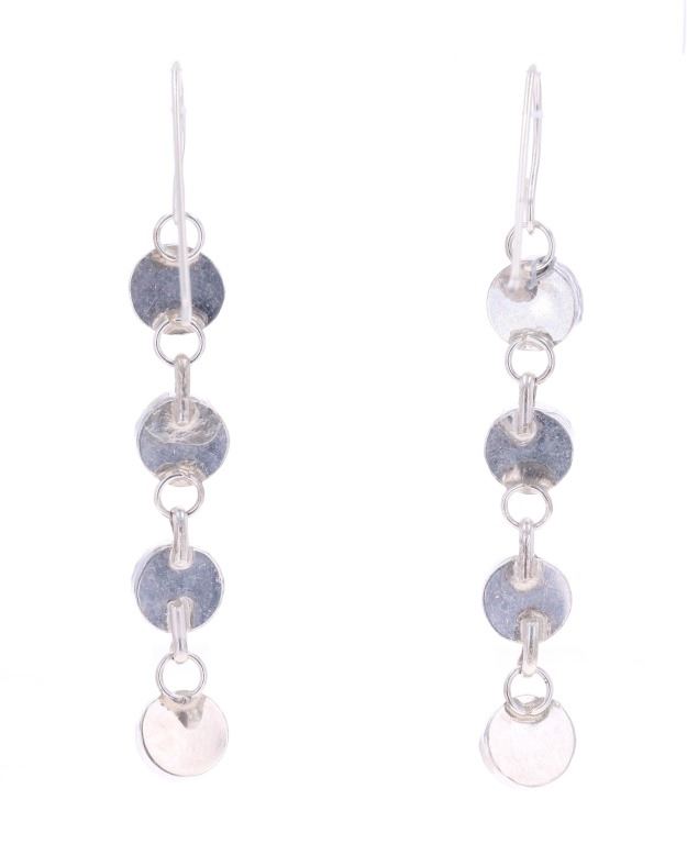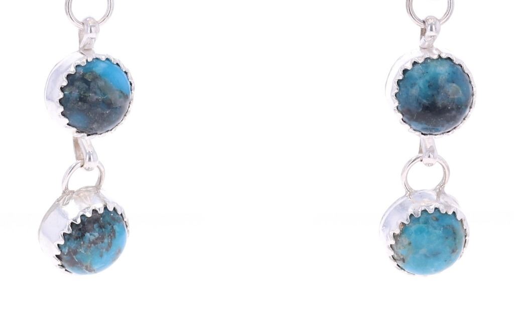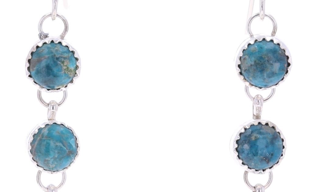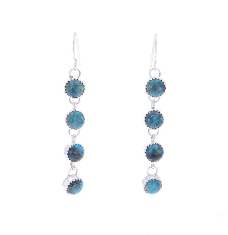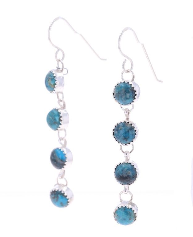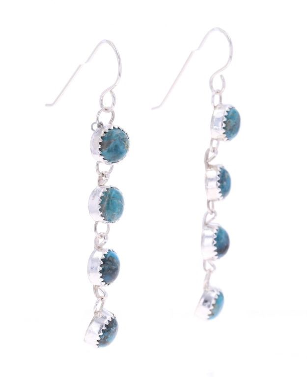 For your consideration is this pair of Navajo sterling and Kingman turquoise dangle earrings. The earrings feature a wonderfully and professionally crafted sterling silver and turquoise construction that shows four links that are set with Kingman turquoise cabochons. The condition of this pair of earrings shows well crafted dangle design that shows good luster to the turquoise and no obvious signs of damage. The earrings measure 2 3/8" L x 5/16" W and have a collective weight of 6.1 grams.