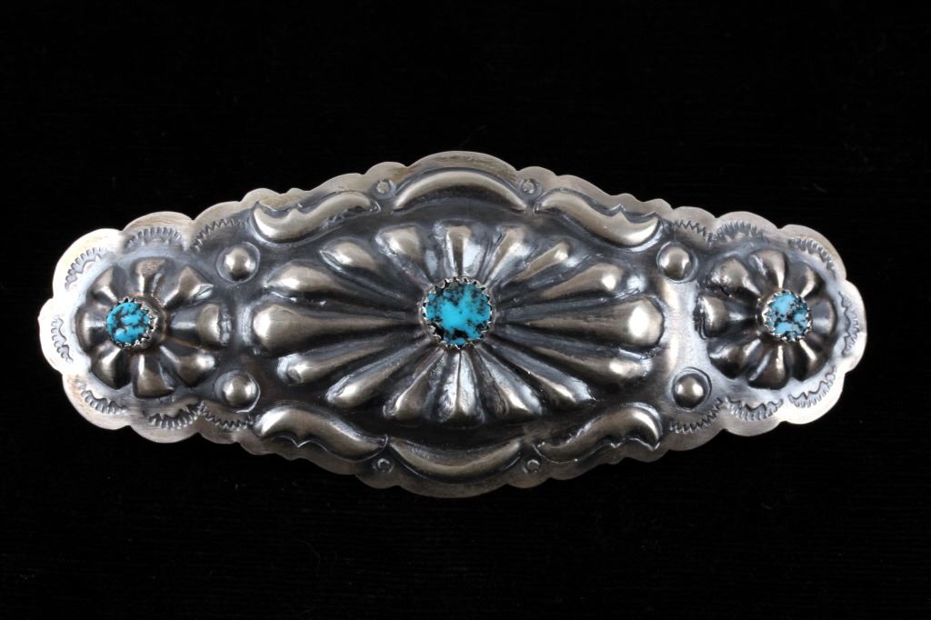 For your consideration is a handmade Tim Yazzie Navajo sterling silver and Kingman turquoise hair clip. This sterling hair clip shows beautiful Native American tooling handmade by expert silversmith Tim Yazzie. This piece is constructed of sterling silver showing a floral pattern and each flower displays a Kingman turquoise gemstone cabochon. The back of the hair clip is stamped with the maker's mark "T. Yazzie" "Sterling" This piece measures approximately 4" x 1 3/4"