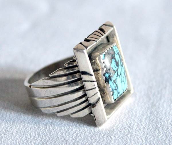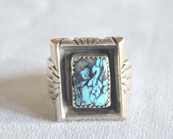 Navajo Sterling Kingman Turquoise Ring, Size 13.5, measures 1''L x .75''W, features beautiful square sawtooth bezel set Kingman Turquoise Cabochon measuring 9/16''L x 3/8''W, small nick out of bezel, carved wide shank, 17.4g in total wt.