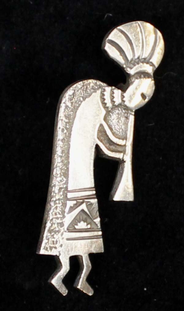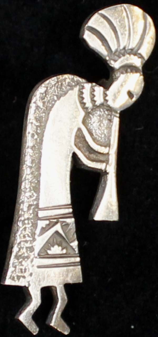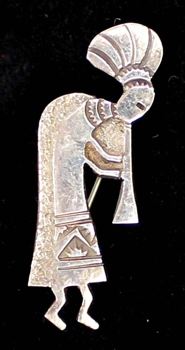 Native American Navajo Sterling Kokopelli Pin, measures 2''L x 7/8''W, stamped sterling