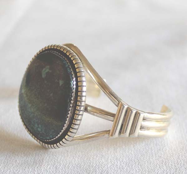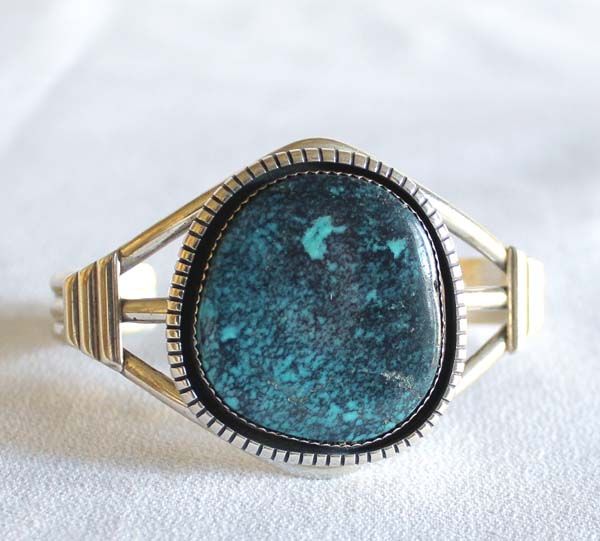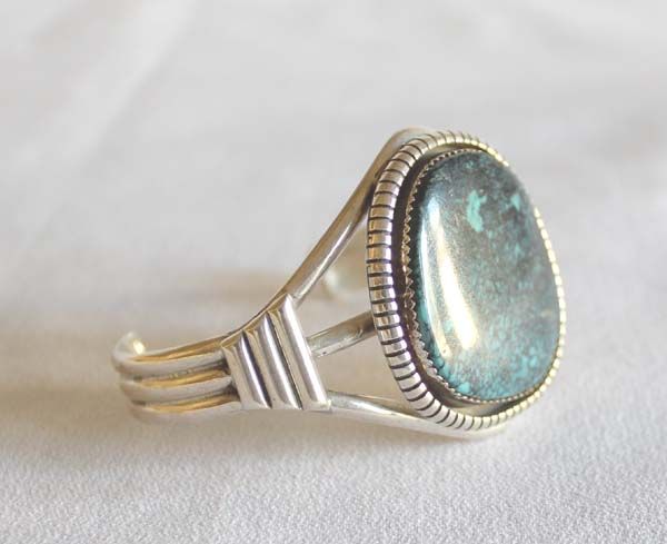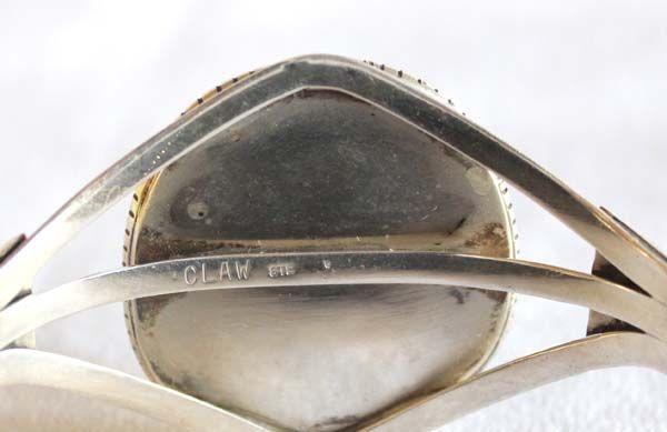 Navajo Sterling Lander Turquoise Bracelet by Pauline Claw, inside measures 6.5'' which includes opebing x 1 5/8''W, split band which fuses into one, stamped sterling and hallmarked Claw, stunning scalloped bezel set Lander Turquoise cab measures 1.25'' x 1.25'', carved silver border, 37.46g in total wt.