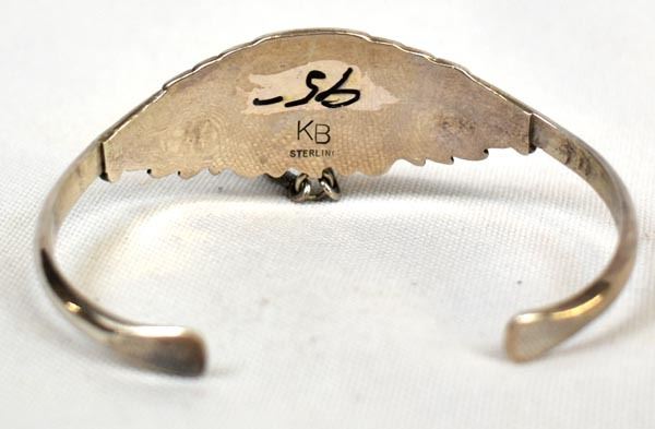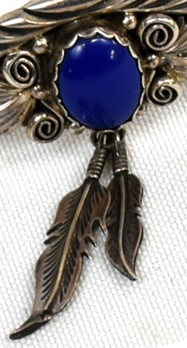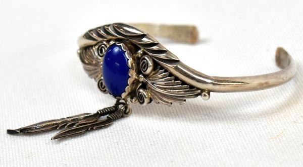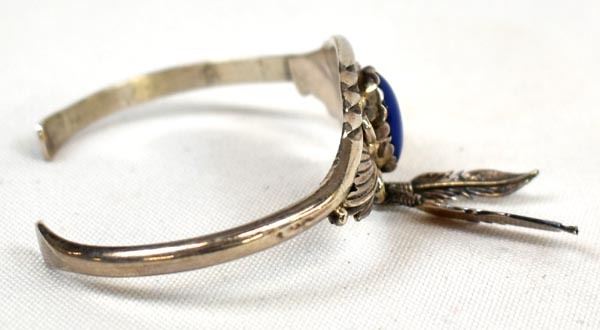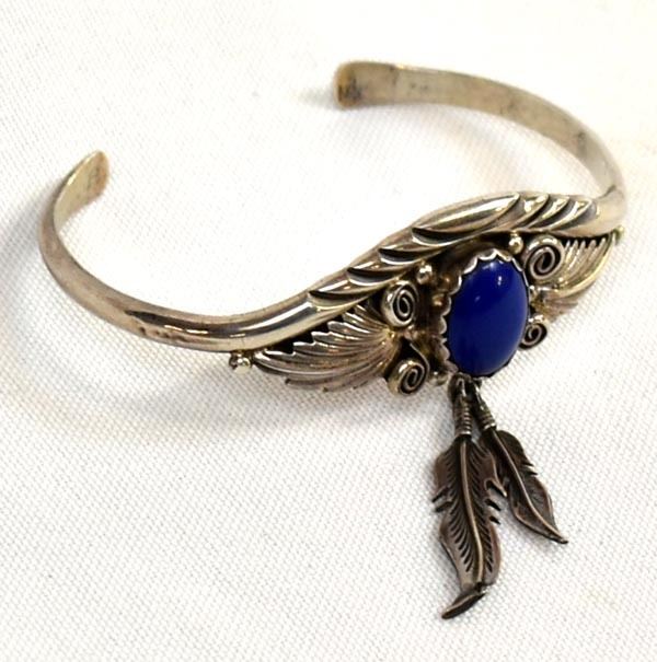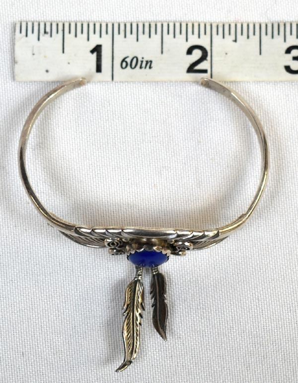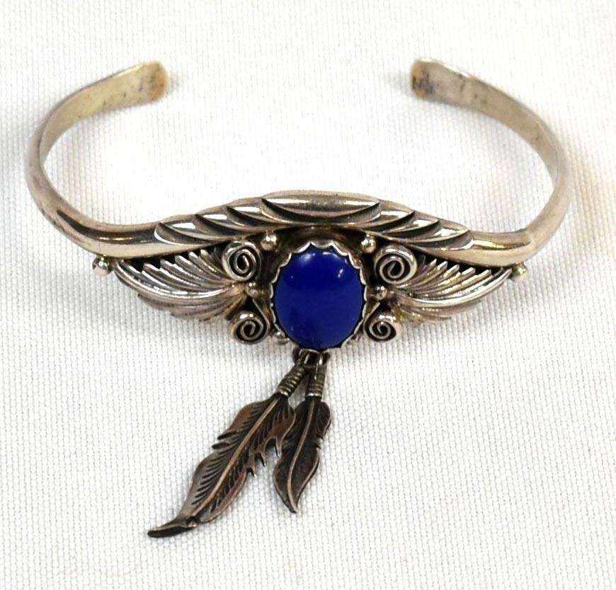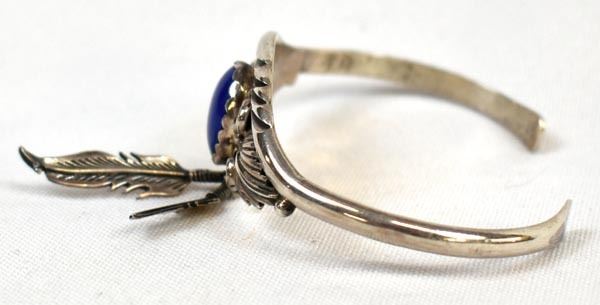 Native American Navajo Sterling Lapis Cuff Bracelet, inside measures 6.5'' which includes the gap x .75''W with a 1.25'' sterling feather dangle, stamped sterling and hallmarked KB