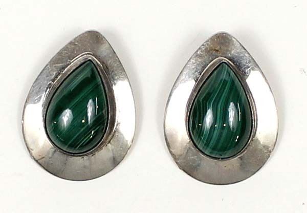 Native American Navajo Sterling Malachite Post Earrings, measure .5'' x 1'' and are hallmarked on the back R. W., stamped sterling