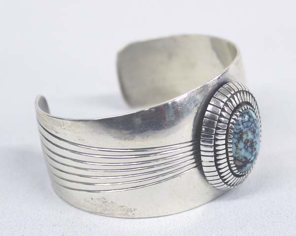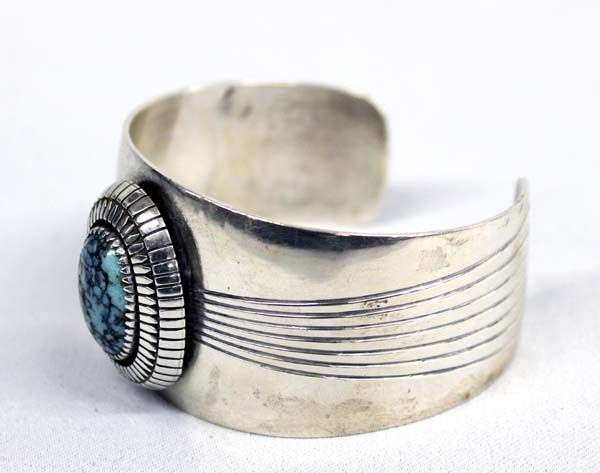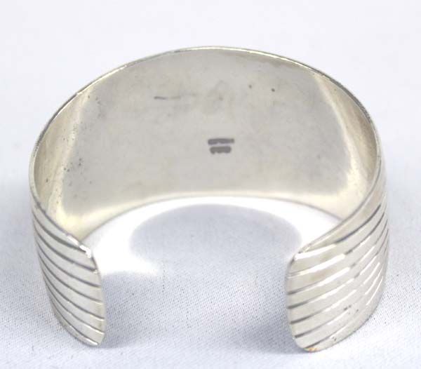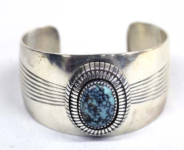 Navajo Sterling Manassa Turquoise Bracelet by artist Gibb. Bracelet inside measurement is a 7'' includes space, and measures 1.75'' in width. Total weight 55gr. Bracelet has a hallmark of GIBB for Gibson Montano.